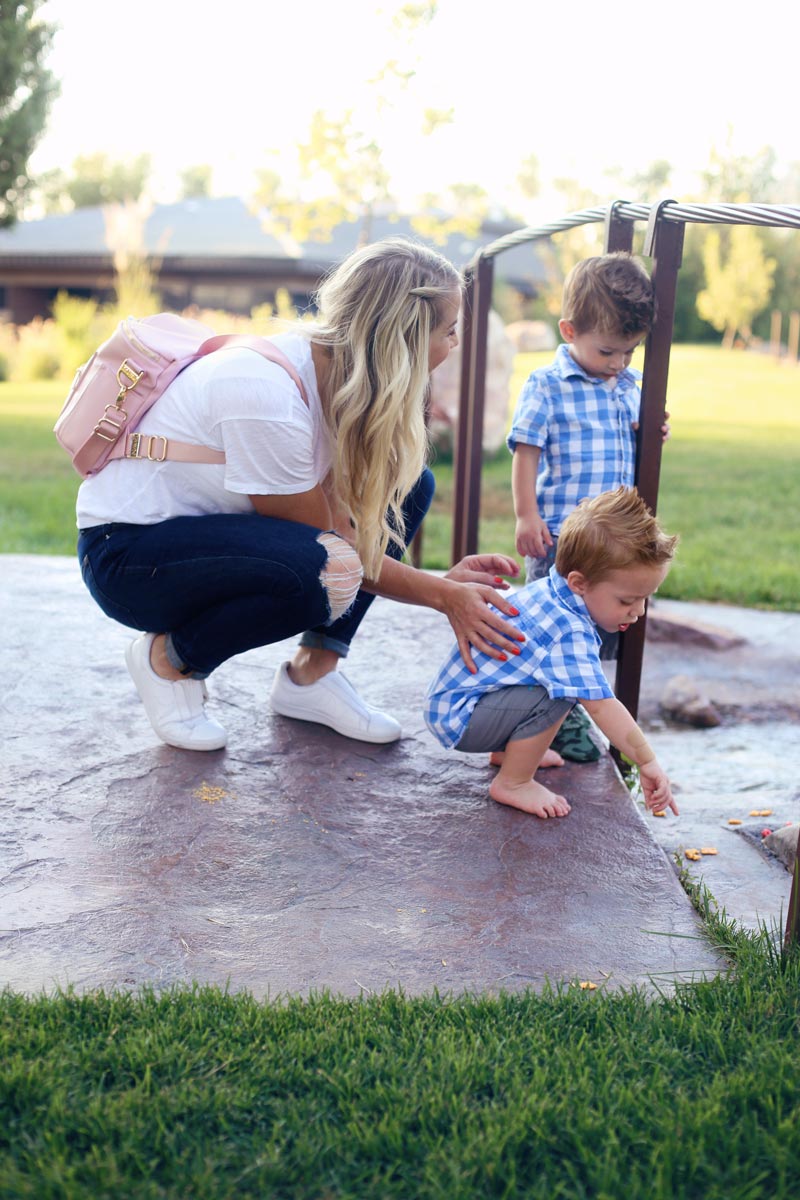 When I found out I was pregnant with twins I was immediately overwhelmed with fear and anxiety. I was and still am completely unqualified! While four kids in five years was not part of my plan, it’s been the most amazing adventure. These babes keep me on my toes 100% of the time. They keep me learning and moving and our life is so full of chaos! But a good chaos. A happy chaos! Last night was one of those nights though where the chaos wasn’t so happy. They were all fighting and screaming and just destroying my house. You know those nights, right?! When things get out of control like that there’s usually only one solution — to get out of the house! Being a mom is so hard and always confusing! There’s always room for improvement. I’ve been sharing a few mom hacks on Instagram stories that help me be a little bit more efficient + organized and I thought it’d be fun to carry the conversation over here and share 10 things that have made my life easier as a mom. 10 mom hacks if you will! They’re sort of all over the place but I wanted to round up a few of my favs interspersed with a couple pics from our night out at the park because let’s be honest, no one likes to read without pictures ? .