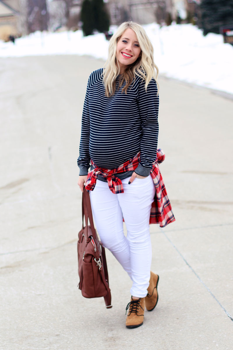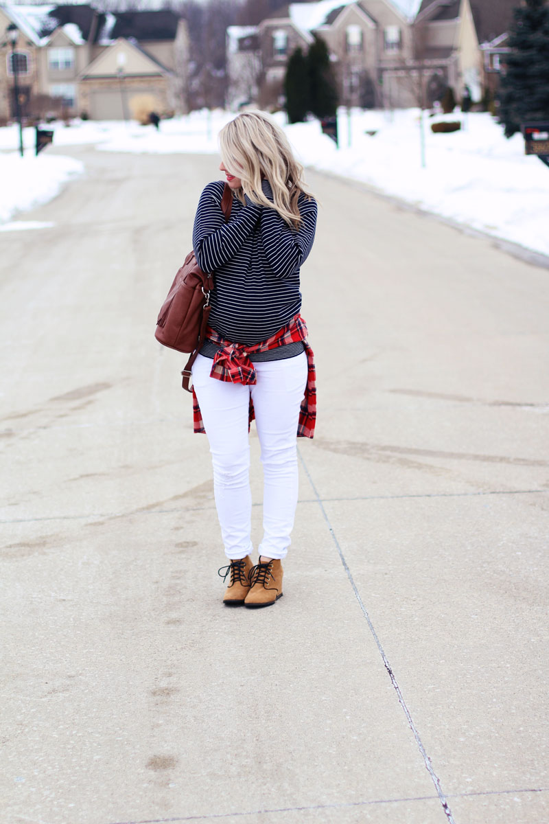 Striped Sweater: Asos | Jeans: Asos Maternity | Booties: Target old, similar here and here | Diaper Bag: c/o Lily Jade | Plaid Button Up: c/o Novae Clothing sold out, similar here and here