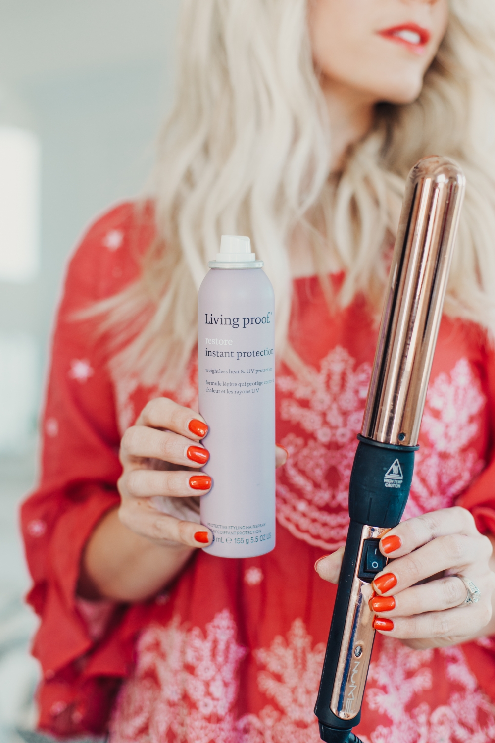 Hair Hack #4 – Use a heat protectant! Oils are great, I love me some hair oil, (this is my favorite right now) but you can’t add an oil all the way up to your roots or your hair will gets greasy. So you need to use a heat spray before you apply any heat to you hair. I’ve been loving the Living Proof Restore Instant Protection Spray. I mostly use this product when my hair is dry because the mist is super fine and it doesn’t wet the hair like other sprays. It also protects it against UV damage and static!