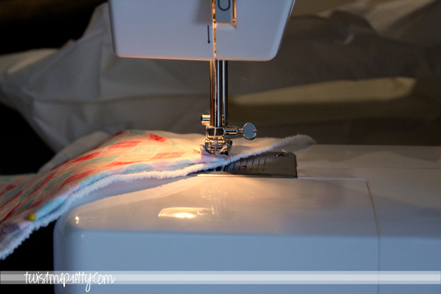 First, you’ll need to wash the cloth diapers. They’re going to shrink a whole bunch so don’t be surprised. Next wash your flannel. It will prevent the colors from bleeding onto the white burp cloths. The flannel will probably get tangled up in the dryer. Just untangle the fabric, cut off the fraying edges and iron the fabric before beginning.
