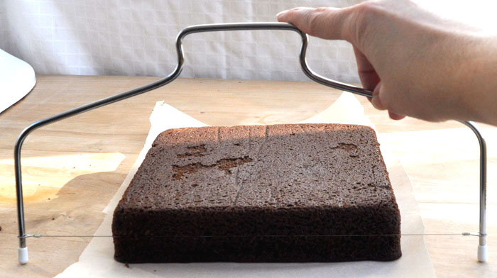 So you’re going to put freezer paper on the bottom of your cake pans so that the cake comes out nice and clean. Then I always stick mine in the freezer for a couple of minutes so I don’t have to wait for the cakes to cool. They need to be completely cooled. Then I pop them out of the pan and use a cake leveler. I had no idea these things existed until a couple of years ago when I took the beginner cake class from hobby lobby. Best thing ever invented.