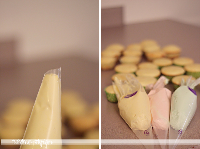 You’ll just snip the top off and pipe an entire circle around the cupcake. Then pipe another smaller circle on top of the first circle of frosting. I totally forgot about this trick until just barely, so that’s not what I did in the photos of the cupcakes. But it will make the piping look much prettier!