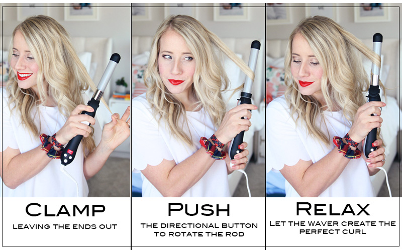 There’s a little one-inch clamp, and all you do is clamp your hair (leaving the bottom inch or so out), push the direction button and relax while the rod rotates and the waver creates the perfect curl for you. So you don’t need to worry about wrapping your hair around a wand, or any weird line from the clamp on your curling iron. I’ve used it a handful of times and it creates pretty curls and I’m really happy with the settings and the way it functions! So to prep each one of these hairstyles, I’ve first curled my hair using the Beachwaver and then added some texturizing spray to help the styles hold!