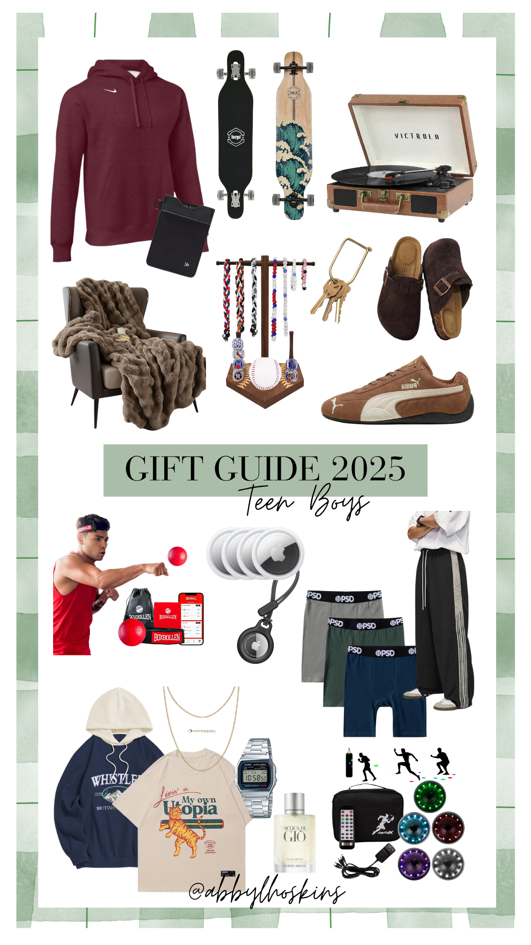 Nike Hoodie / Card Holder / Longboards / Record Player / Rain Bunny Necklace Holder / Key Chain / Cloggs / Brown Pumas / Boxbollen / Airtags 4 pack / Airtag Holder / PSD Underwear / Track Pants / Tiger Graphic Tee / Casio Watch / Cologne / Agility Training