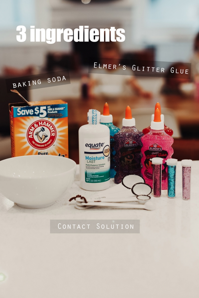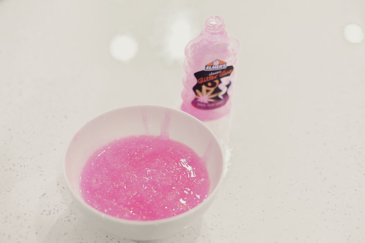 INGREDIENTS: Elmer’s Glitter Glue (6oz) + Baking Soda + Contact Solution and more glitter if you want!