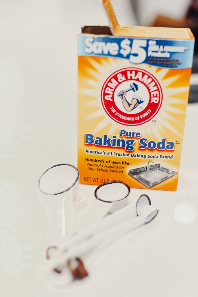 Step two: After that we added 1 TBS of baking soda to the glue and then they stirred it around with a spoon. Next they added some glitter, totally optional and honestly a little unnecessary because it was already in the glue. They just wanted it when we were at the store so I figured why not!