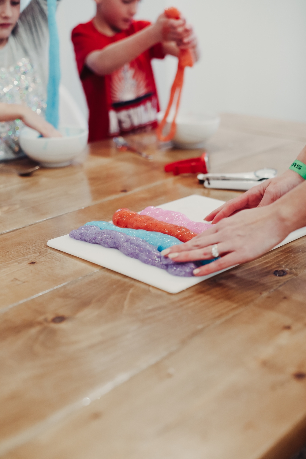 When we were finished mixing, everyone gave me half of their slime and I rolled the colors up on a cutting board. I cut the slime so each had a small piece of each color, and then the kids twisted the colors together!
