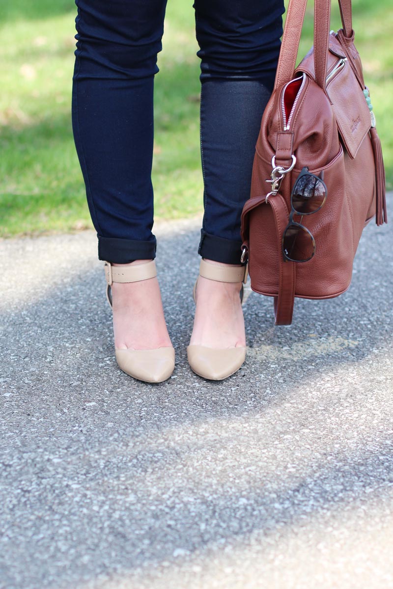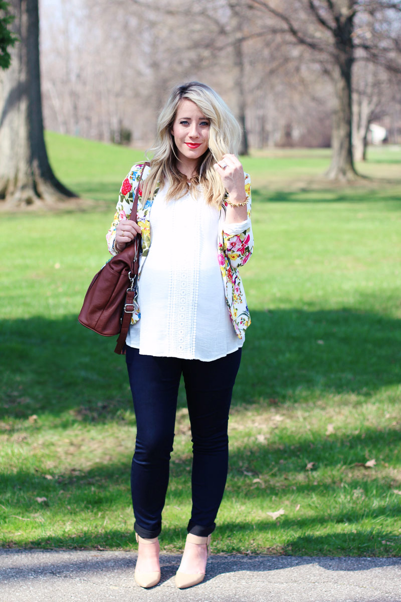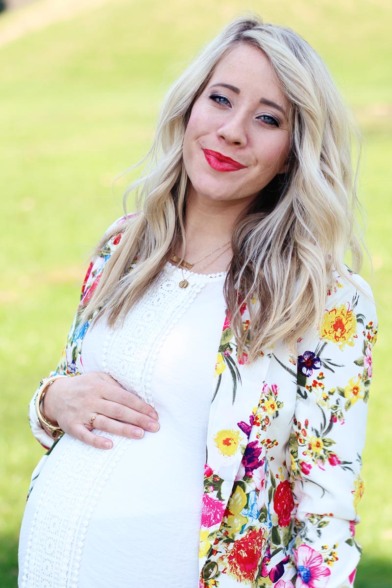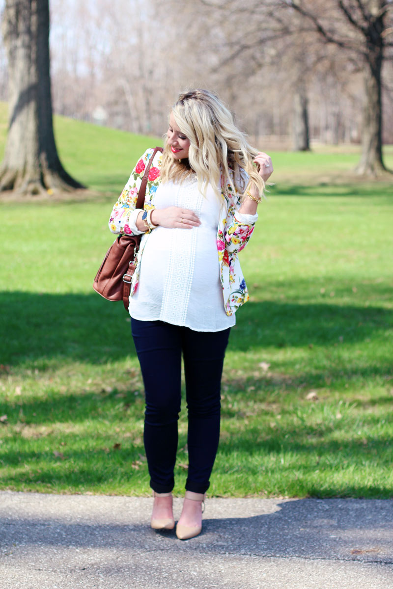 White Lace Tank: c/o Target | Maternity Jeans: c/o Target | Floral Blazer (old forever 21). Similar styles here, here and here | Sam Edelman Pumps: Nordstrom | Gold Necklaces: c/o Made By Mary | Blue Druzy Bracelet (old) c/o Lillie + Tori similar here | Lipstick: Mac All Fired Up | Diaper Bag: c/o Lily Jade | Sunglasses: c/o Sunglasses Shop
