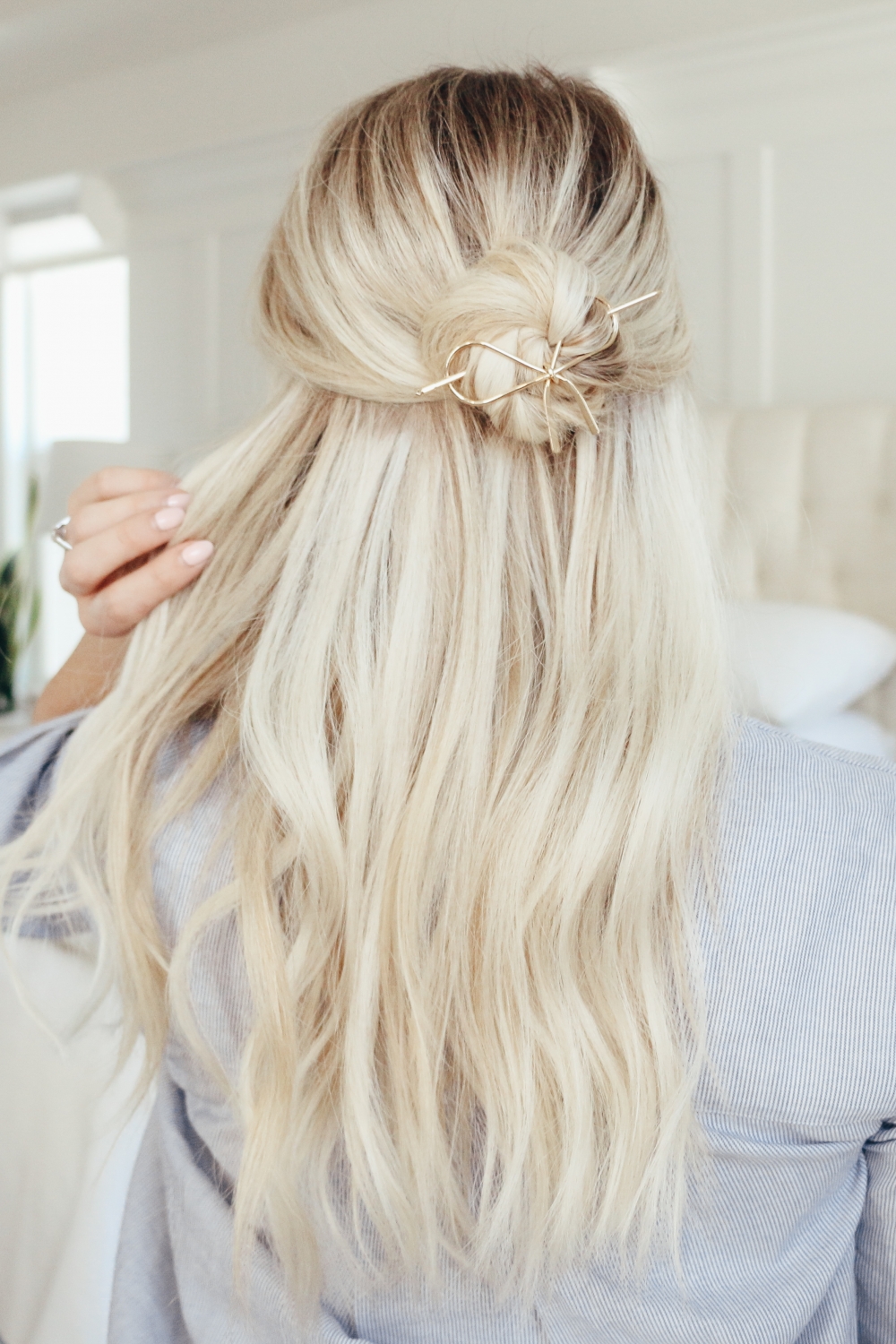 First up, we’ve got our half up cinnamon bun garnished with a pretty little bow. Haha, see what I just did there?! I got the brass bow at ASOS and it’s currently sold out, but this one is adorable and will give you the same look.