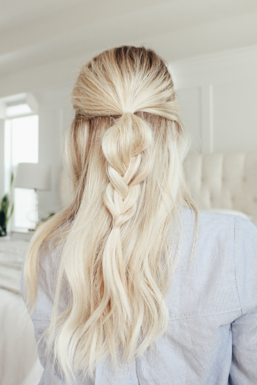 Then we’ve got a super easy half-up braid. This is one of those great hairstyles to wear when your trying to avoid heat but can salvage a few left over curls from the day before. Or for when you need your hair pulled out of your face but want a little extra glam.