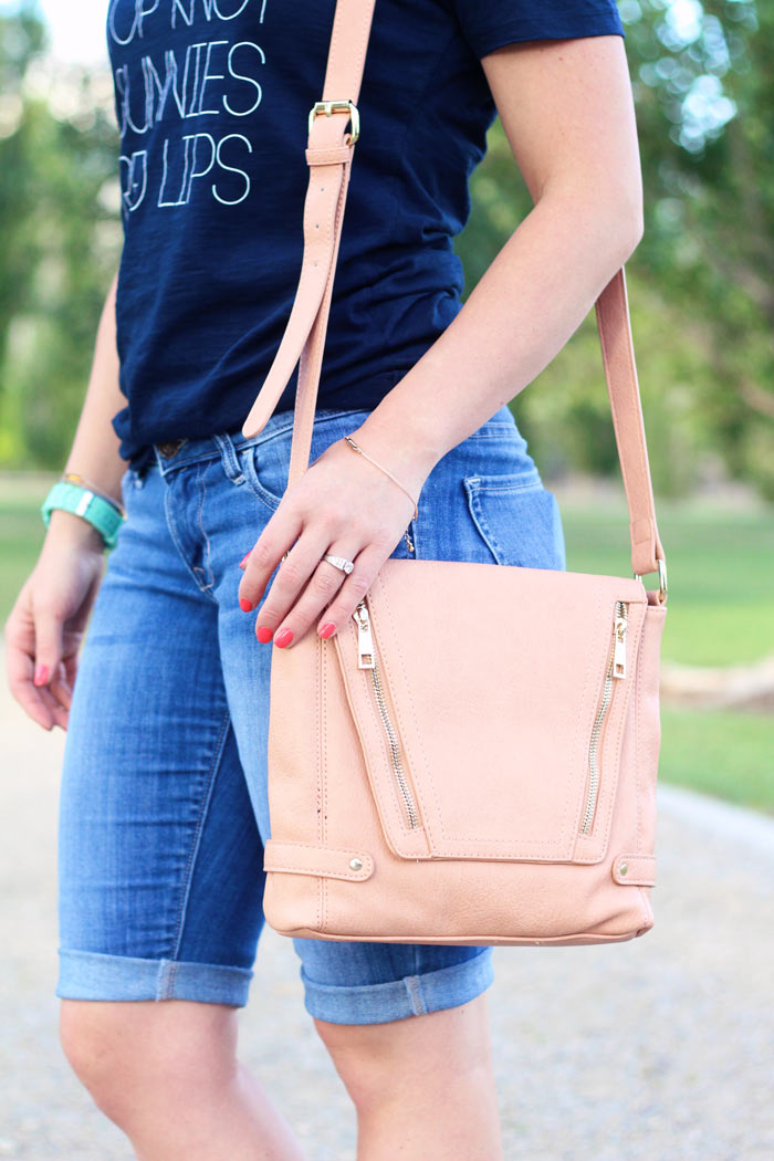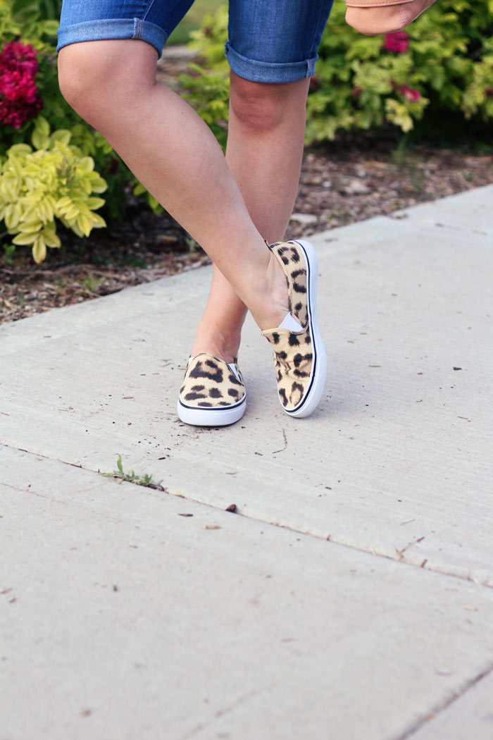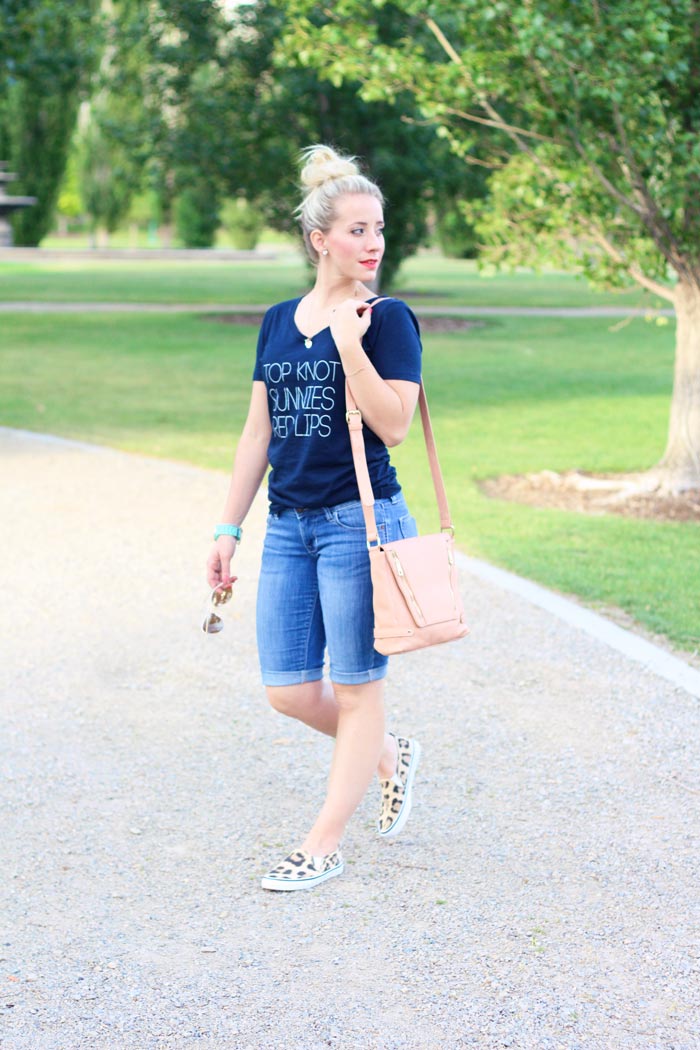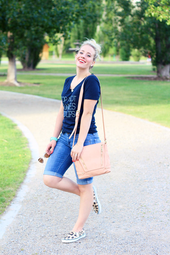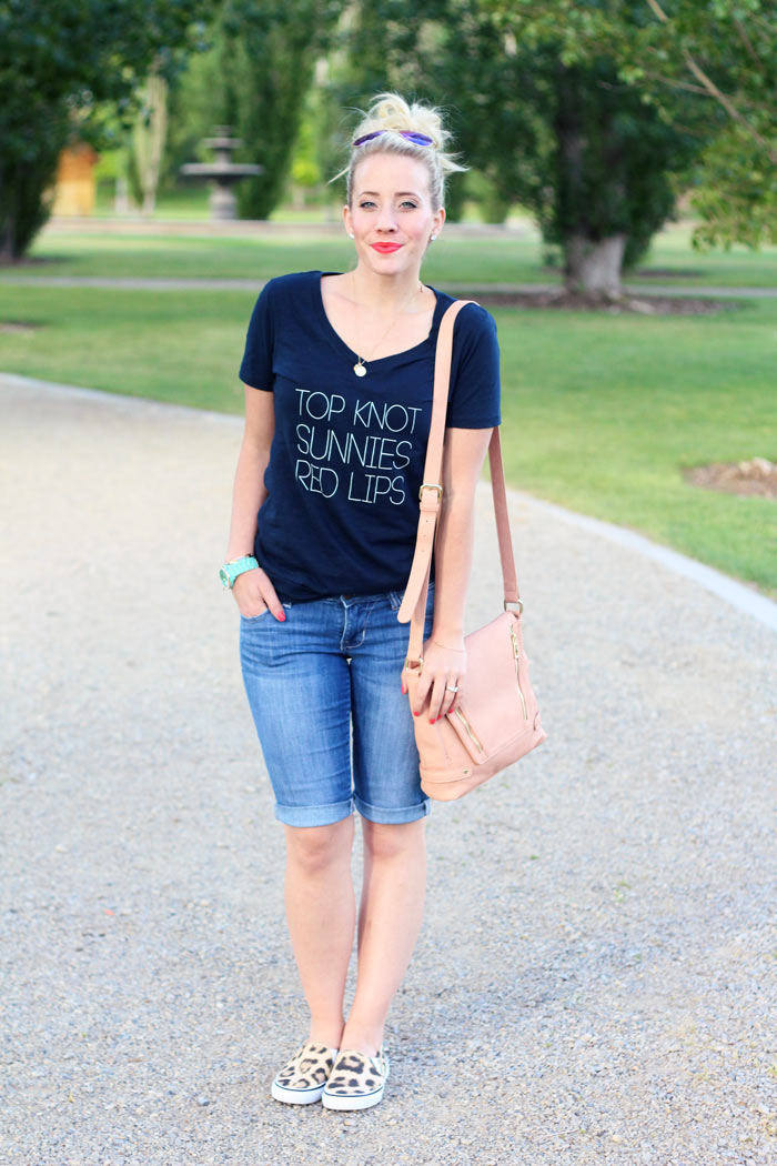Top: c/o Olive Lane Shop (I’m wearing a large and it’s the perfect loose fitting tee) | Shorts: DIY from these jeans | Blush Bag: c/o Sole Society | Leopard Sneakers (the best shoe ever invented) | Sunglasses: gold green ray ban aviators | Watch: c/o Kiss Me Mint, similar here or here | Necklace: local boutique, similar here | Bracelets: Kohls | Lipstick: Maybelline Vivids Vibrant Tangerine