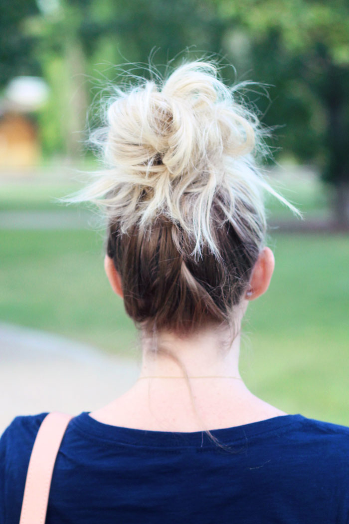 1) Do something with your hair. We all know that after a few hours of running around with the kids, or sitting in meetings, whatever it is you do with your days, your hair goes flat. It’s just inevitable. If you pull your hair up into a top knot, you’ve got volume all day. If you braid your hair back, or add an accent twist into your bangs, you’ve now spiced up your look and added a bit more interest. Who cares what you’re wearing when your hair is pretty right?! Sometimes the styles that take the least amount of time can make the biggest difference.