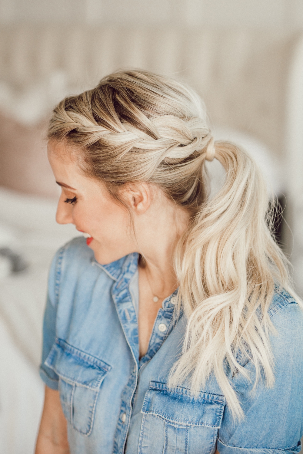 Leave out a large section of hair in the front and pull the rest of the hair up into a ponytail. French braid this section back. The top strand is going to go OVER the middle strand and then the bottom strand is going to go OVER the bottom strand. That’s your first stitch. When you’re finished with your braid, stretch it out so it looks nice and full. Then wrap the braid around the ponytail and secure it by adding another clear elastic around the whole ponytail!