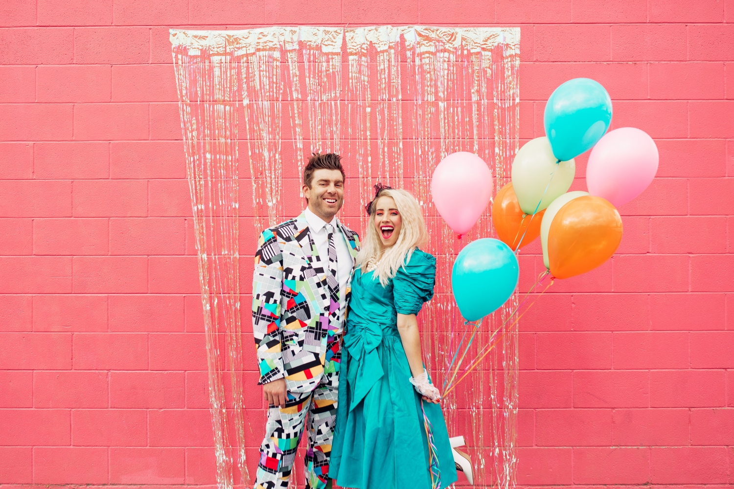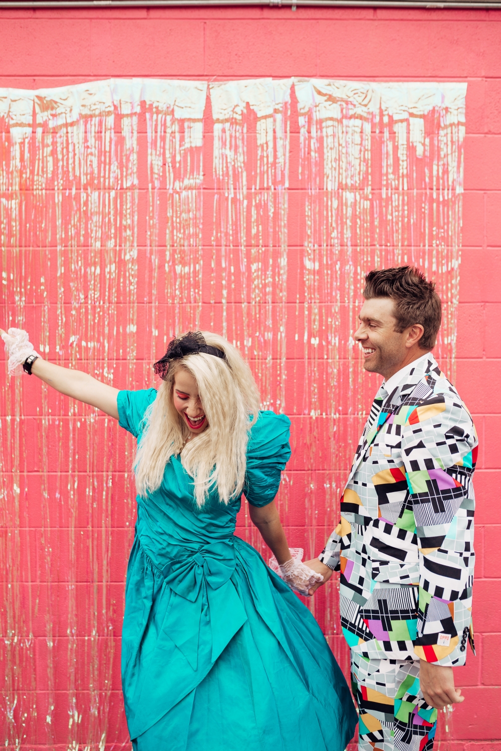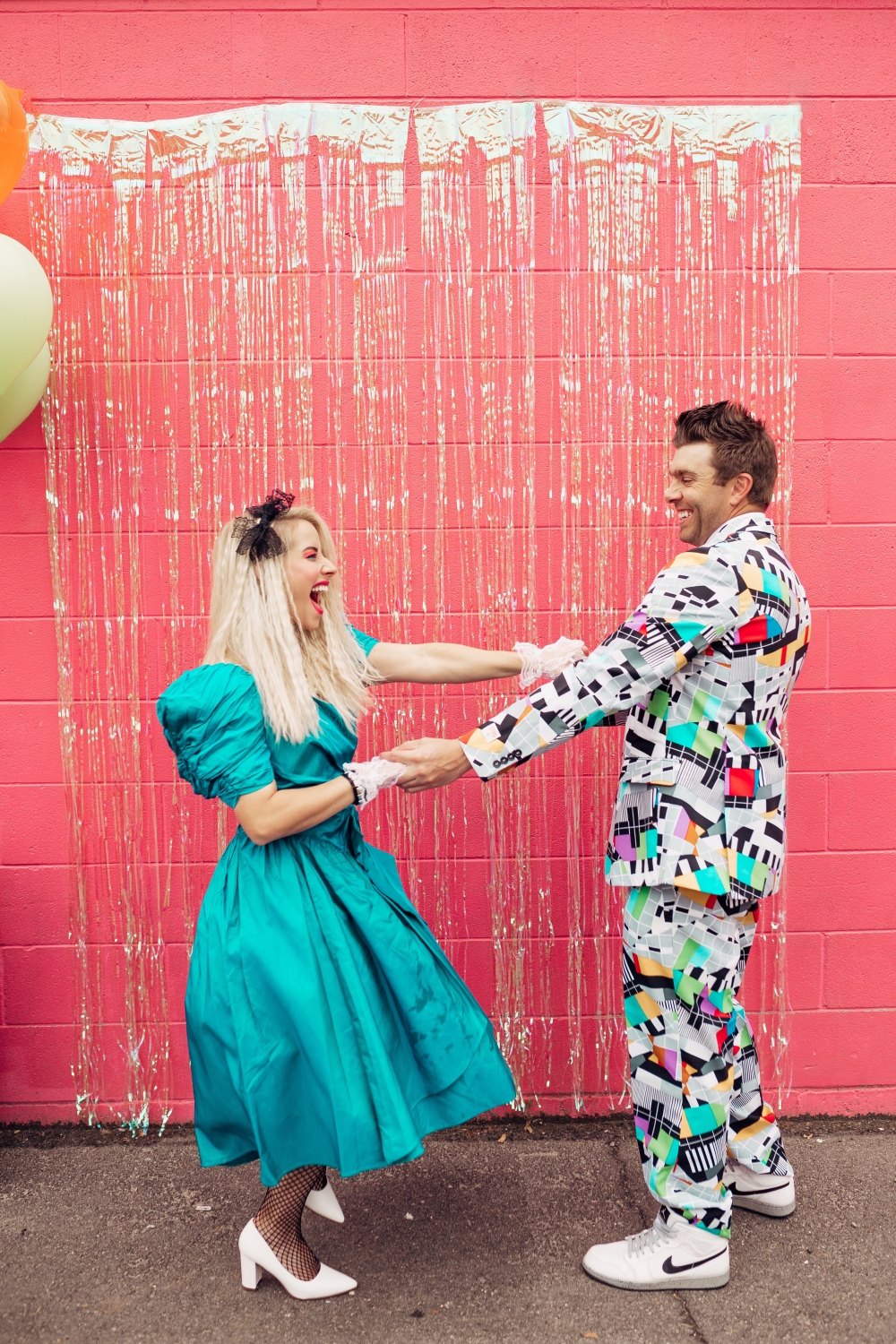 No you didn’t Abby… YES I DID!!!! I DID! I don’t think I’ve ever had this much fun in my entire life. And can we just talk about Brain’s suit for a minute? We were MADE TO LIVE IN THE 80’S!!!!!!! Okay… sorry… I’ve calmed down… it’s just sooooo good!!! Today I’m sharing our 80’s couple costumes for Halloween and tomorrow I’ll be dishing the drugstore makeup tutorial + 3 super cute and easy hairstyles you can rock with any of your 80’s costumes. So let’s rewind for a second and talk about the planning for this costume.