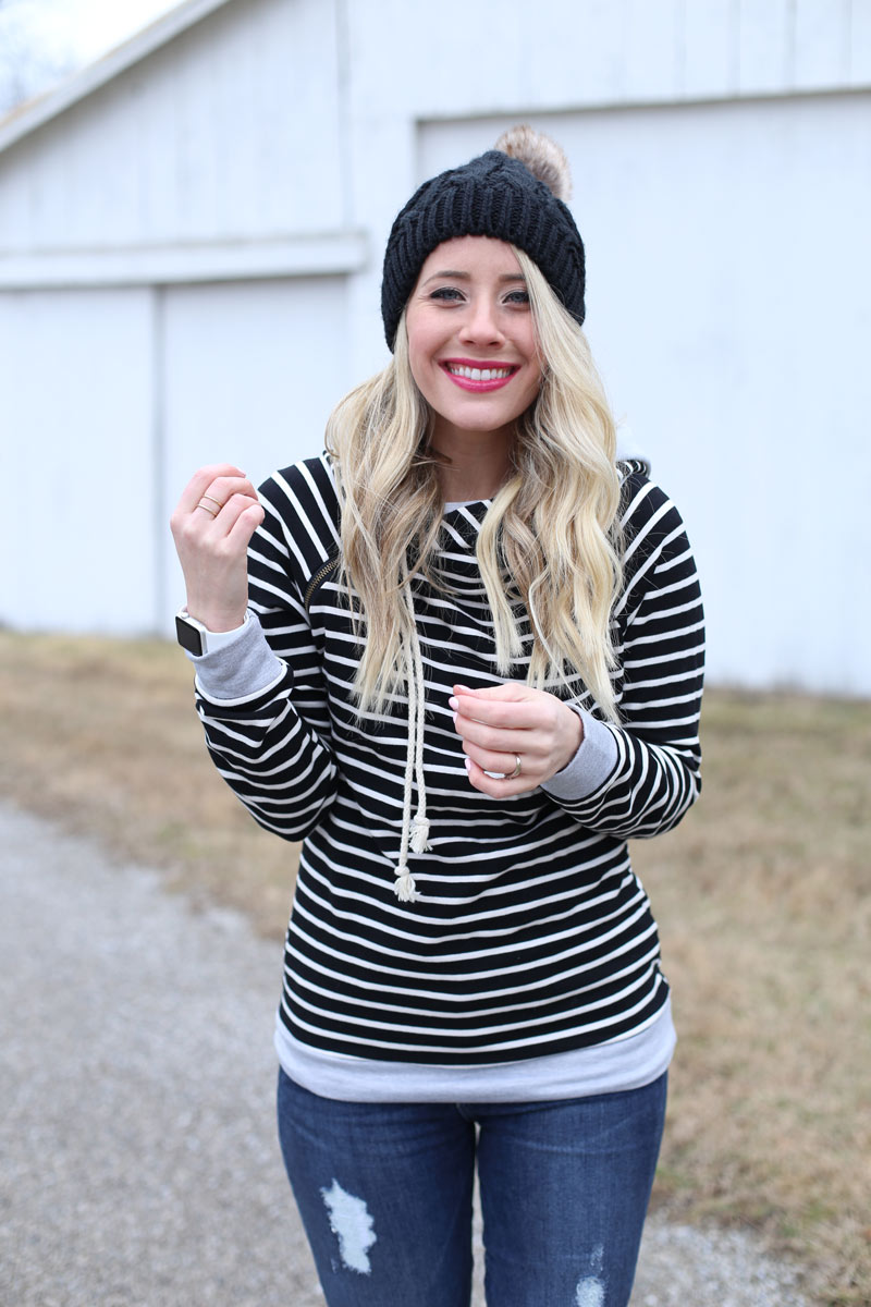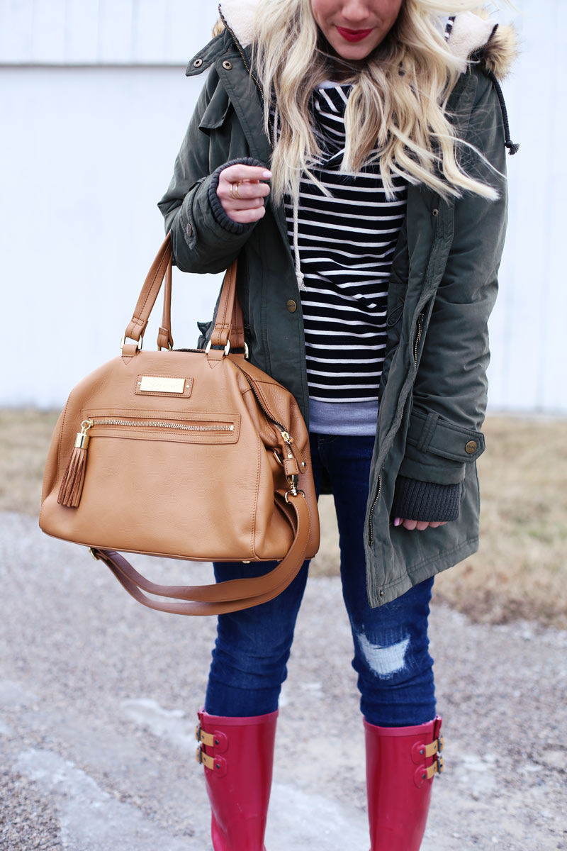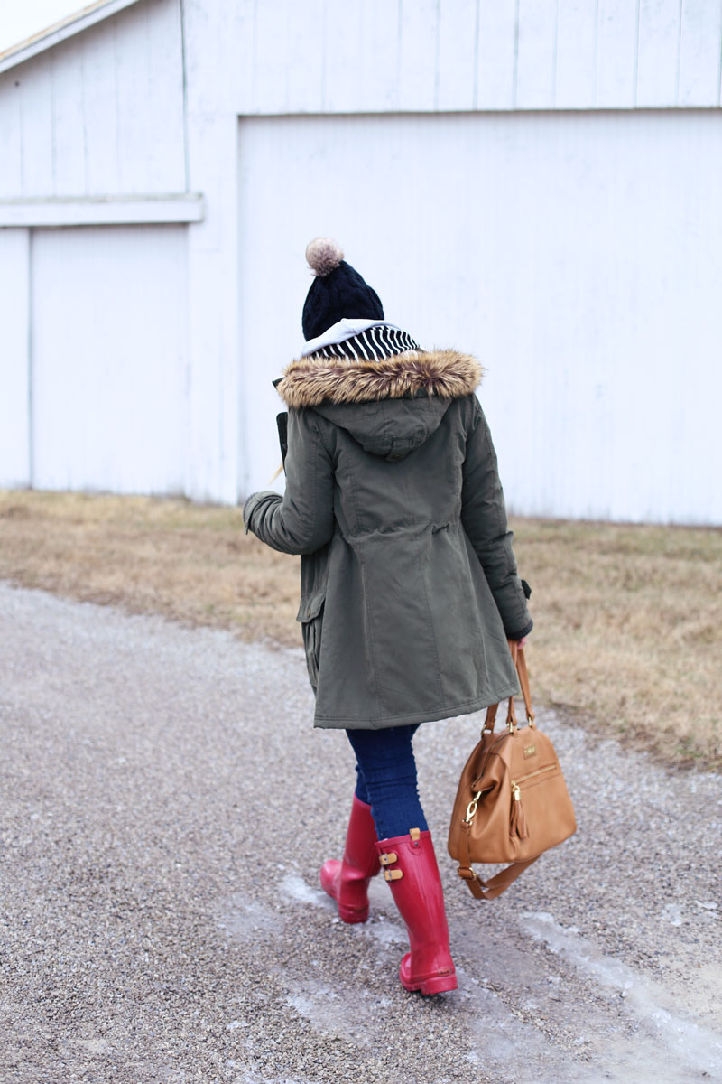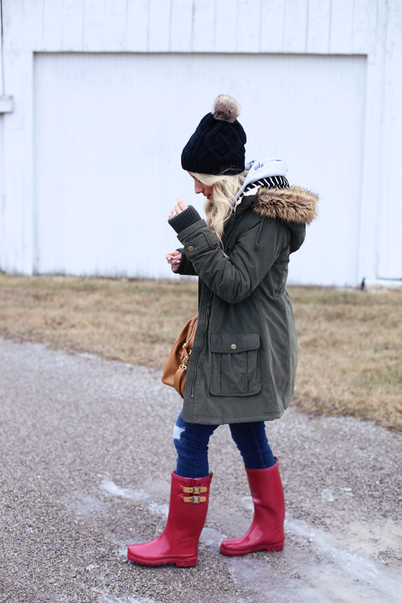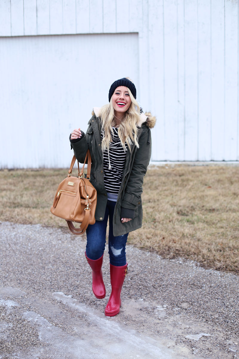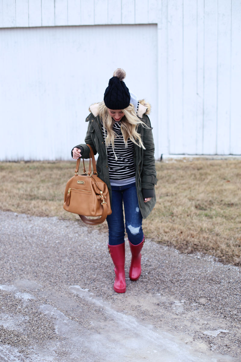 Sweatershirt: c/o Mindy Mae’s Market | Jeans: Gap | Boots: c/o Chooka | Bag: c/o Claudine and Ash similar splurge here and save here | Coat: Nordstrom (ON SALE!!) | Beanie: similar here and here | Jeans: Gap (ON SALE and sizes going fast!) similar distressed but lighter wash here