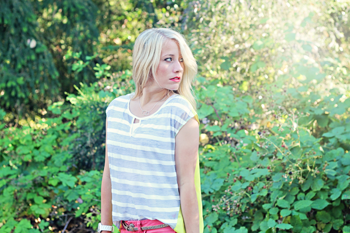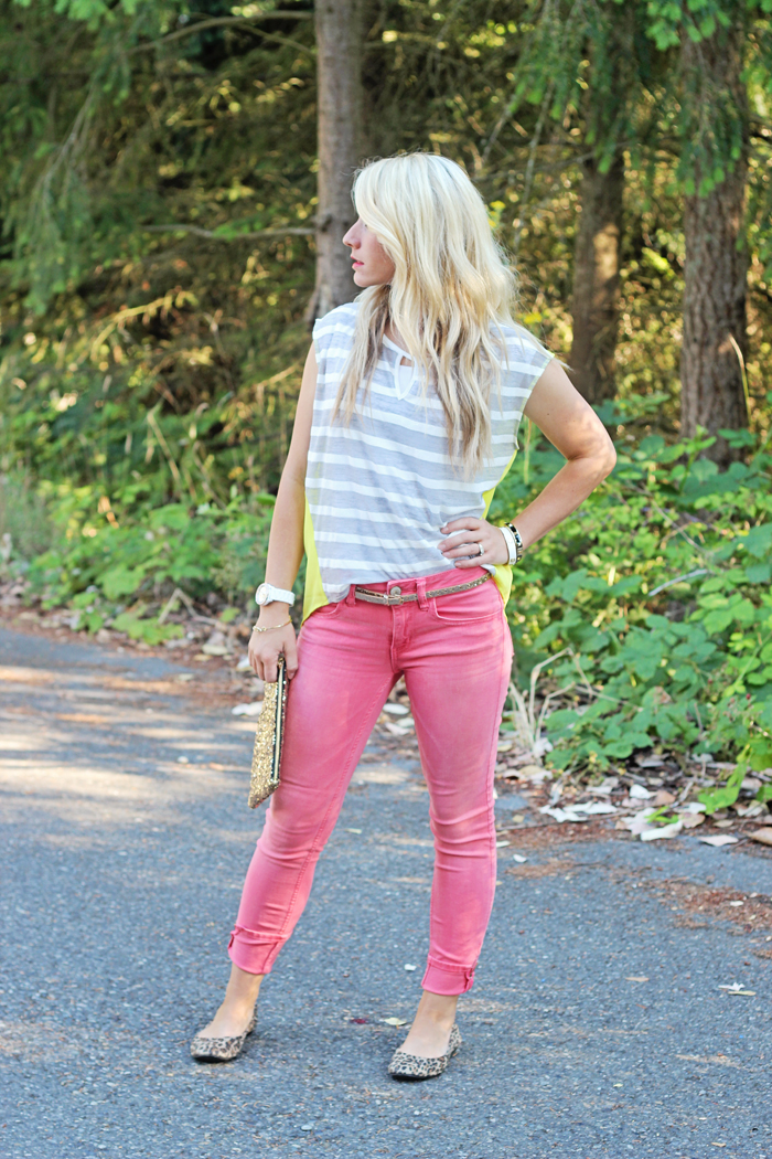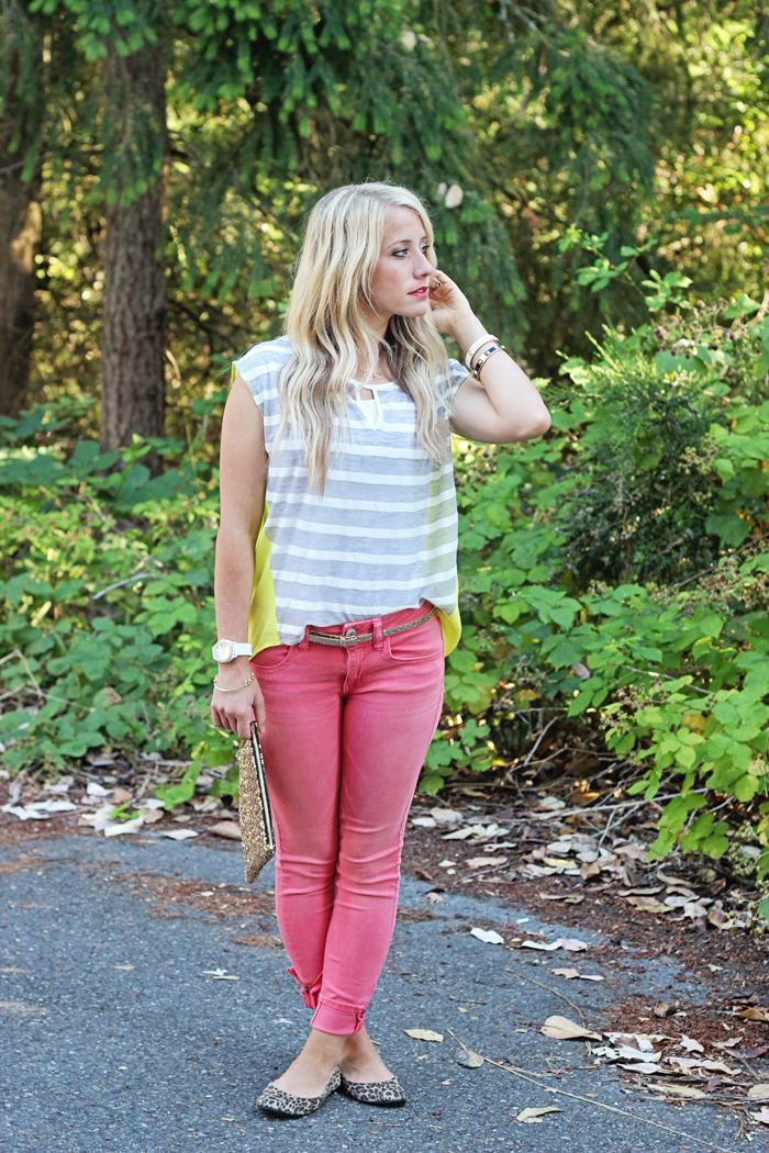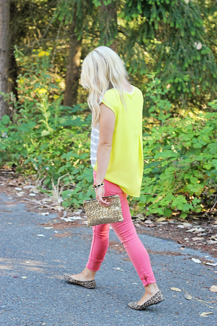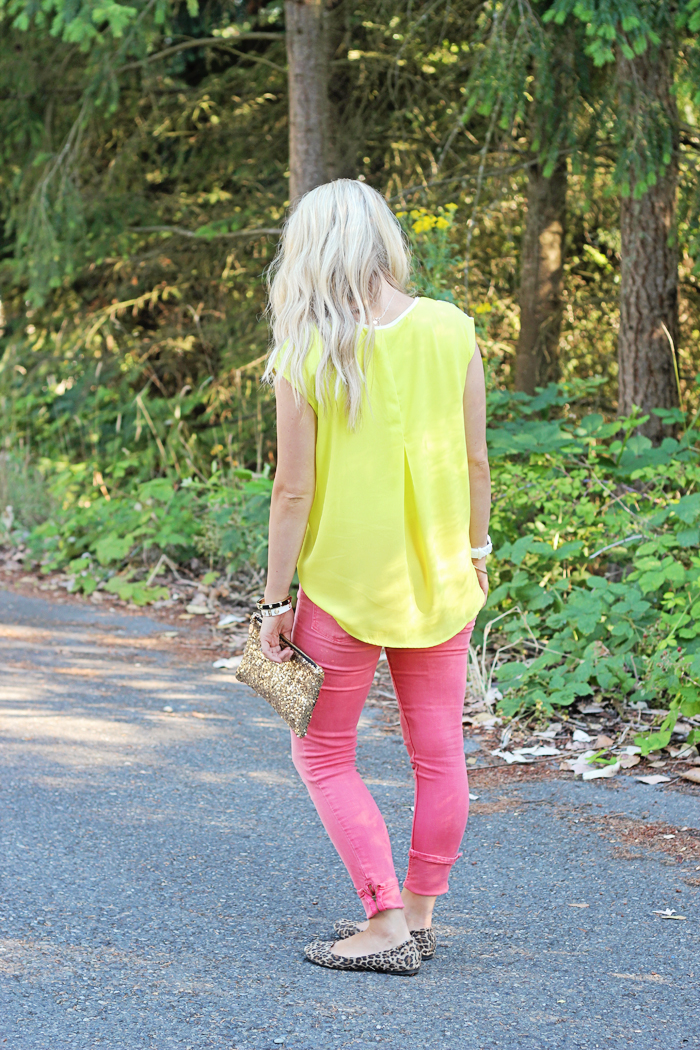 I am obsessed with this outfit! The coral pants & yellow back of the top is georg!