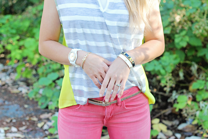 Shirt: c/o Sugar Love Boutique // Pants: AE Jeggings (old) // Watch: c/o Kiss Me Mint // White and Black Bracelets: c/o Sugar Love Boutique // Love Bracelet: c/o Nest Boutique // Clutch: c/o Hello Fab // Belt and Flats: Target (old)