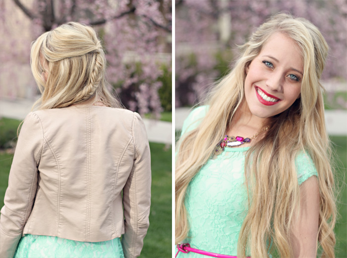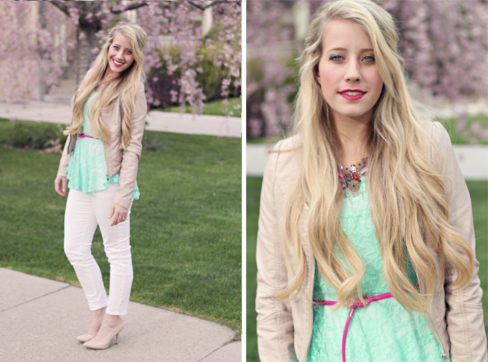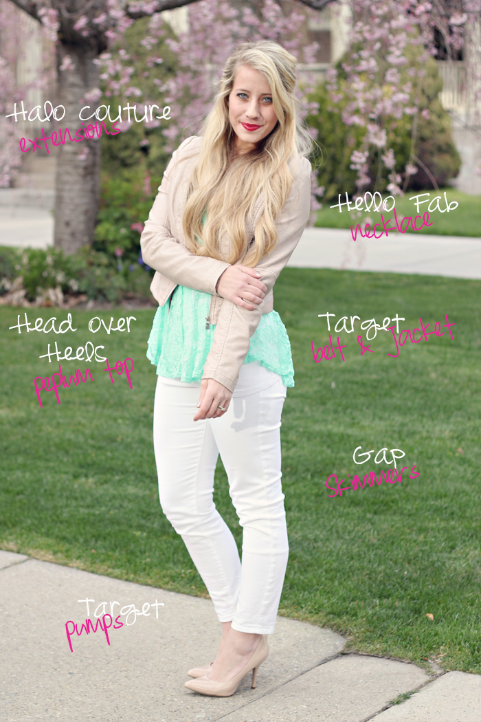 Extensions- c/o Halo Couture // Lace Peplum Top- c/o Head Over Heels // Pink Necklace- c/o Hello Fab // Belt, Jacket, Pumps – Target // Pants- Gap