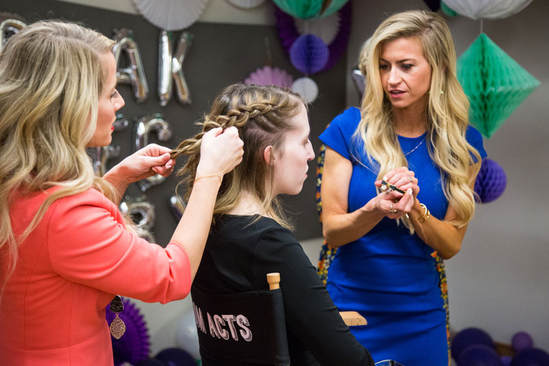 My job was to do her hair and makeup before the show. She wasn’t used to wearing a lot of makeup, so I picked some very neutral colors for the eyes, did a soft pink blush, and a little bit of lipgloss. I did two dutch braids tied together in the back, and gave her a few loose curls. I wanted her to feel like herself, but just extra special for her big debut performance.