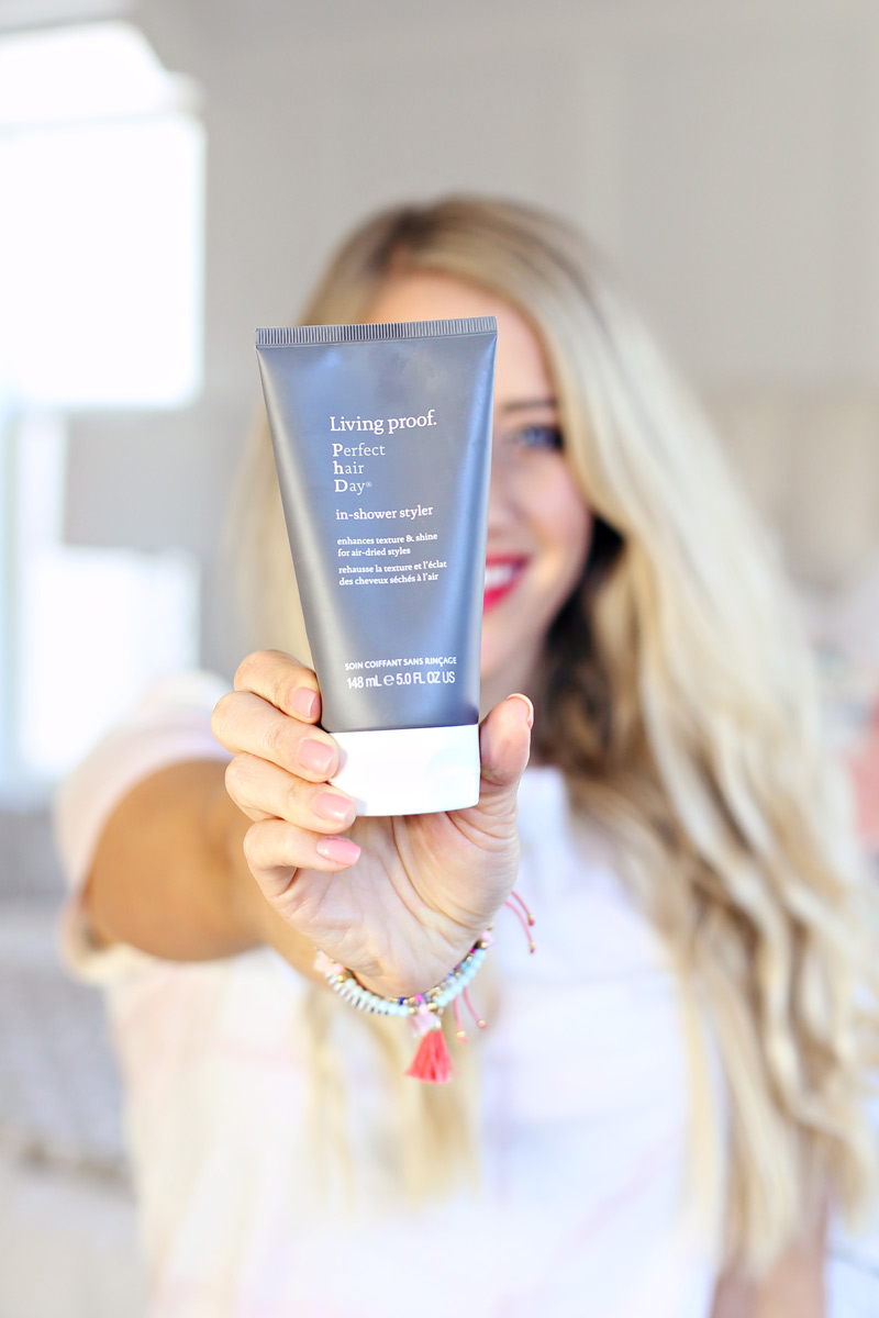 Now the only reason these waves aren’t a crazy mess of tangles and frizz is because of the new In-Shower Styler from Living Proof. Have you guys heard of it yet? This product enhances your hair’s natural texture and gives body, softness and shine for your air-dried styles, and I was so excited about it that I’m taking on a one-week challenge ditching my hot tools and just using this product to help me air dry! Lemme show you how it works.