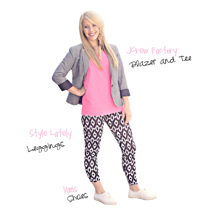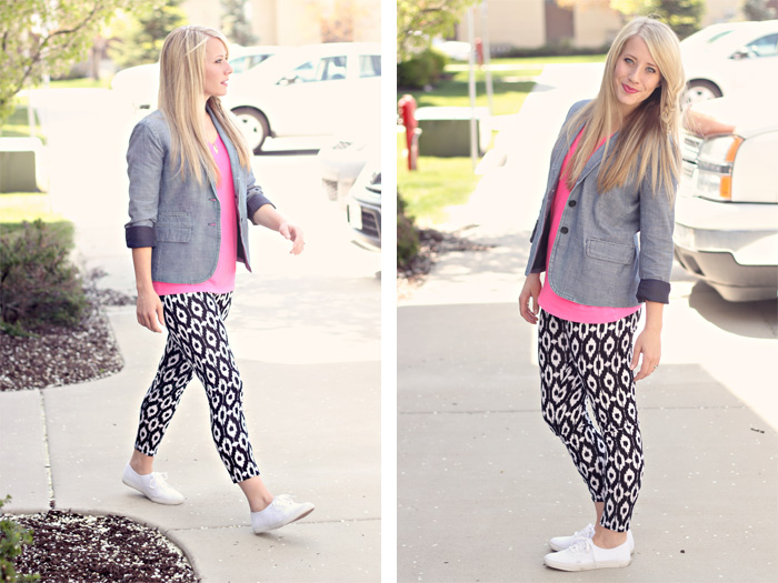 These leggings are so freeeaakkkking comfortable. The pattern is a little crazy so that’s why we wear it with a plain colored tee and blazer. Haha, looking at me- dishing fashion advice. A colored sweater shirt would be sooo cute too!