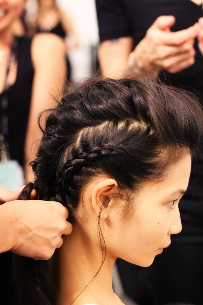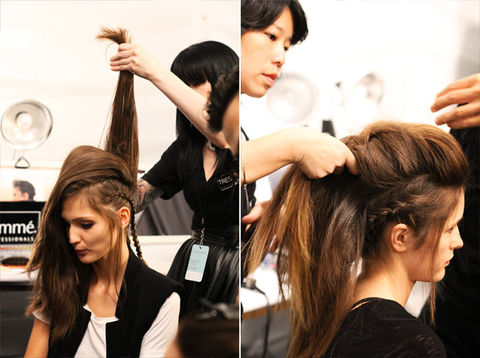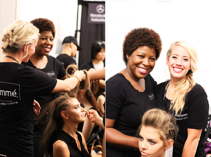 You guys — I have no words. Being backstage at the Marissa Webb show was CRAZY. Literal out of body experience! There was this intense energy that was so thick you could have sliced it with a knife. There was so much going on, so much press, so much talent and the models were ridiculously beautiful. I got to hang out with Jeanie, TRESemmé’s lead hairstylist. She had me help her out with a few things but mostly I got to just watch her being the amazing creative she is. Marissa and Jeanie decided on two looks for their models, the braided faux hawk look and then a side five strand braid. Because I’ve already done a tutorial on the five strand braid I chose to really focus on the braided faux hawk style. Because I couldn’t help myself I threw together a video of what backstage was like and a tutorial of this hairstyle — it’s different from the other videos I’ve done in the past but I hope you love it and it’ll definitely give you a better idea of what it’s like backstage at a major fashion show!