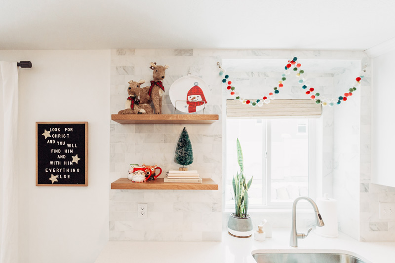 Over the summer, we ripped out backsplash and the cabinet that went to the left of the sink. We replaced it with a marble rectangle tile and then these oak shelves. I LOVE THEM!!! It’s such a cute little space. The letter board is from Letterfolk, the reindeer are from Pier 1 last year (although I’ve seen them every year) and the rest is from Target. I was planning on putting a little picture frame behind those mugs but never found one I liked. Also, what is going on with my snake plant ? Do you see that one leaf that’s twice as high as the rest? Little weirdo plant, I love it!