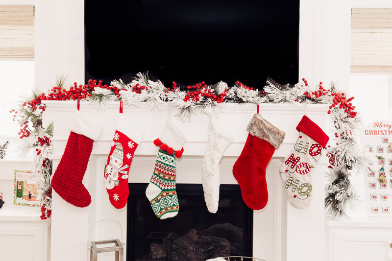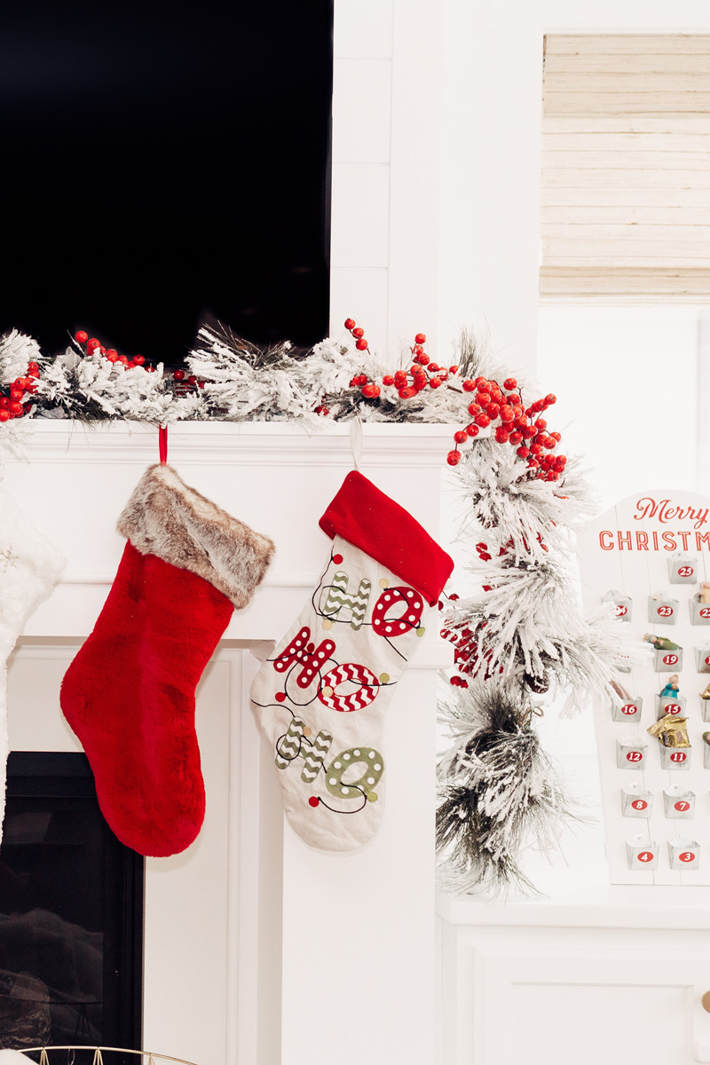 Our stockings and the Merry Christmas banner are from Pier 1 and the garland is from Tai Pan. TRICK TO FLOCKED GARLAND!!! Ready for it? Before you bring it in, spray it real good in the street or your garage with Polyurethane. It’ll bond the flocking to the garland and it won’t shed!!! Well, it’ll shed a little but it’s been AWESOME!! You’re welcome. Tell all your friends haha!