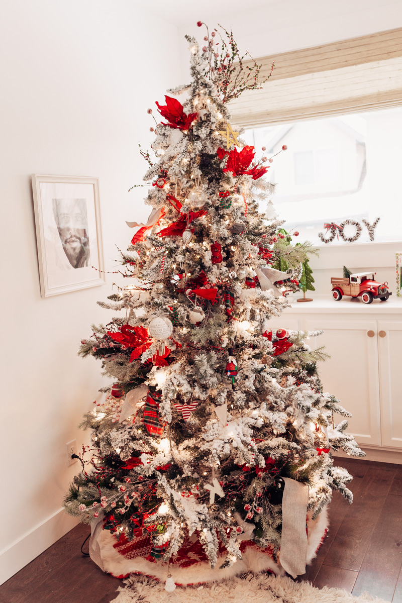 It’s so hard to get a good picture of this tree– the lighting on it is always so weird but it is BEAUTIFUL!!!! I’m realizing I hadn’t fixed the ornaments and picks before we took these pictures from when the twins got to them, but next year I’ll update you on this tree and how I put it together. I basically bought a bunch of picks from Tai Pan Trading (where the flocked tree is from), layered them up and tied them together with ribbon. Then all you do is place the picks throughout the tree. The picks aren’t super cheap, each individual pick is fine but adding them all up becomes expensive. They add so much fullness though to the tree! We have a few ornaments from Target and my favorite home made ornaments, like the star, hand prints and reindeer. I’ll chat more next year when there is time for any of this to actually be helpful!