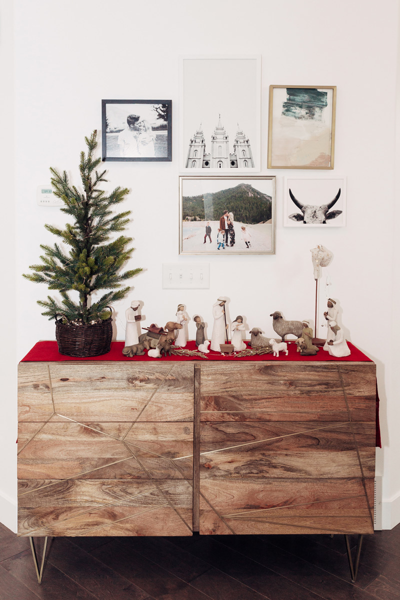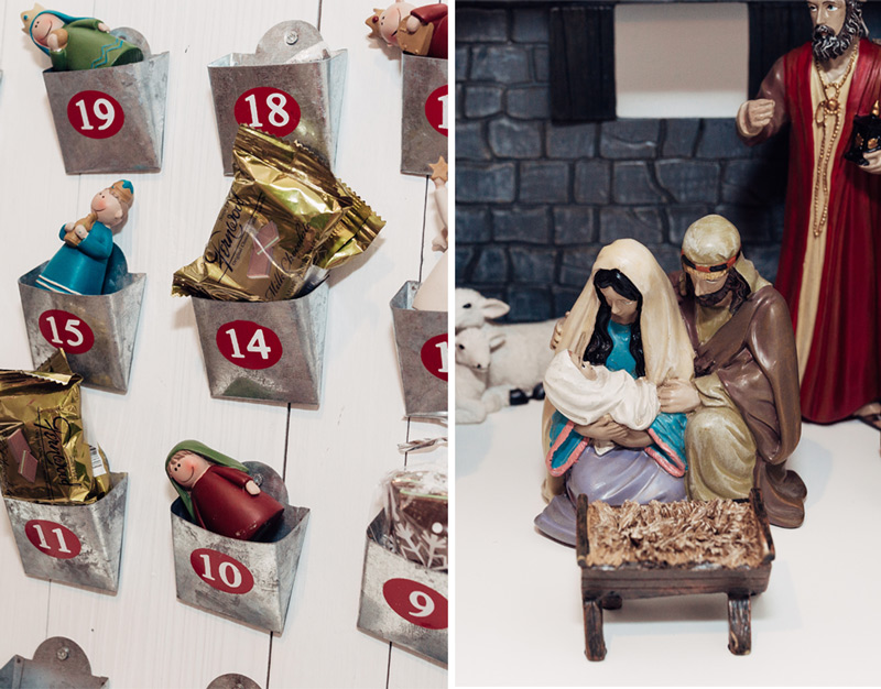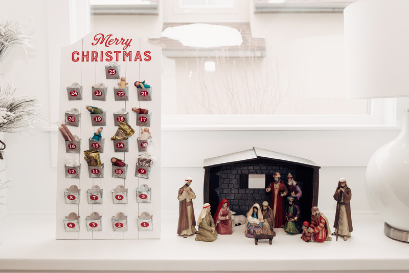 To the right of the fire place, we have our Christmas calendar and new manger scene my Mother-In-Law gave me. Actually, she gave me both of these pieces — she’s the best. She had the candy and child manger scene already put in the calendar and when she saw the dog had broken my manger scene, she brought me this one. I literally do not deserve her. It’s the Greg Olsen Manger Scene and it’s beautiful. How cute of an idea is it to fill the count down calendar though with treats AND a manger scene the kids can put together? I love it!