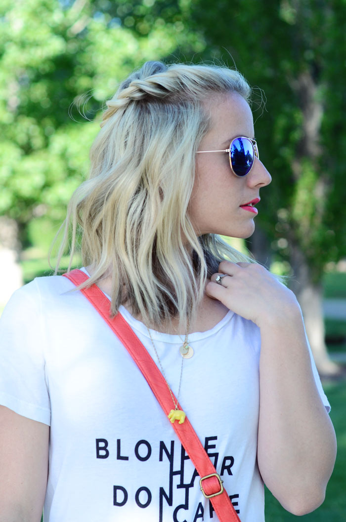 I wanted to pop in and show you this adorable Blonde Hair Don’t Care t-shirt. One of my favorite things in this entire world is a good graphic tee. This one is super soft and fits loose which I love. I was torn on how to style it because it’s SO cute with ripped jeans, with colored shorts, with fancy skirts… pretty much with anything. I chose to pair it with a stretchy and comfy skirt I like to wear on super hot days.