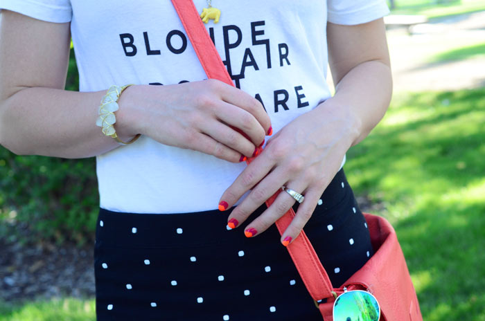 Tee: Recycled Consign & Design | Skirt: Old Navy | Bag: Target | Wedges: Old Navy (in stores only) | Bracelet: Recycled Consign & Design | Necklaces: Soel Boutique at the Riverwoods and JCrew Factory | Lipstick: Shocking Coral by Maybelline | Sunglasses: Old Navy | Nail Tutorial and colors here