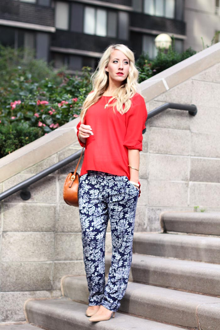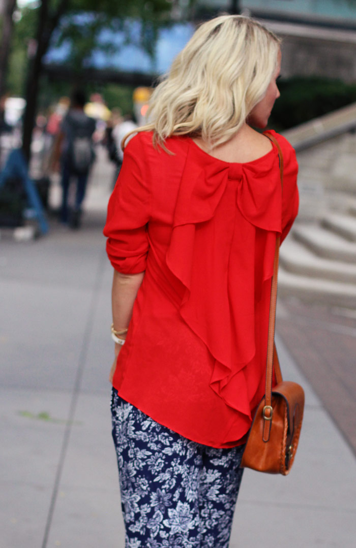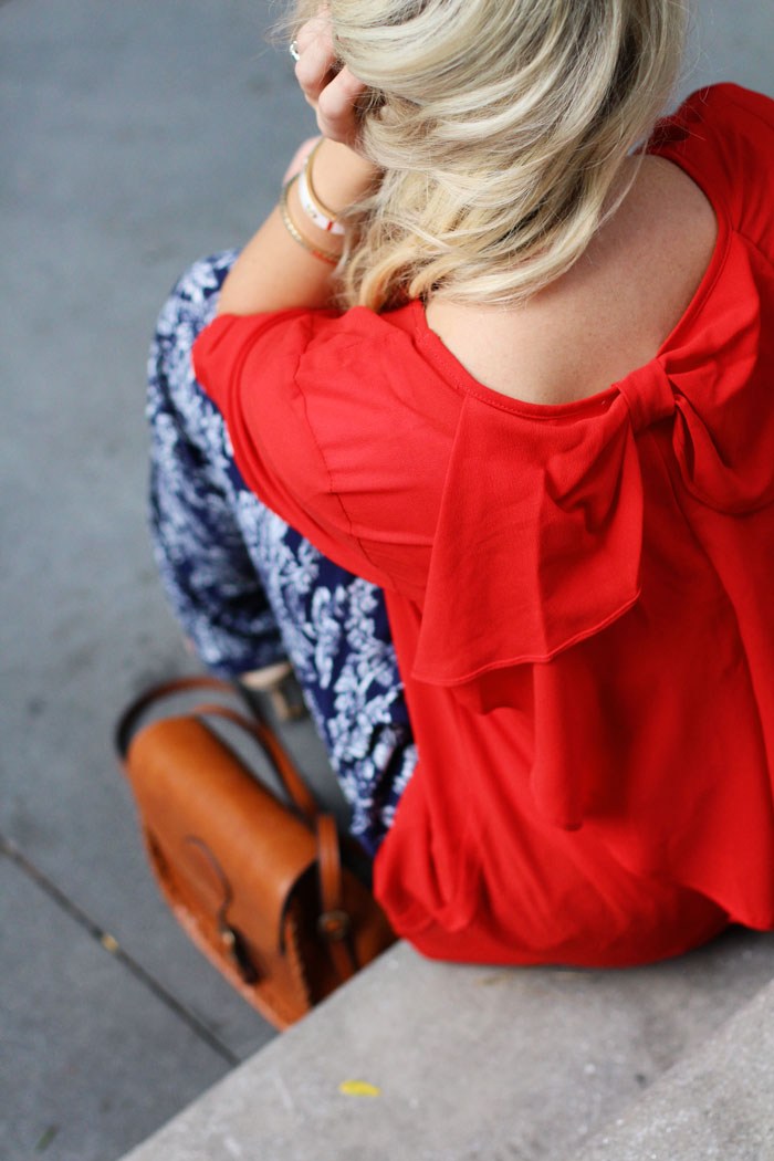 Red Bow Top: c/o The Mint District | Floral Pants: Nordstrom Rack (only a few left and on clearance at 60% off!) | Nude Pumps (crazy comfortable): Sam Edleman | Rings: c/o Sole Society | Bag: c/o Sole Society, love this one here too