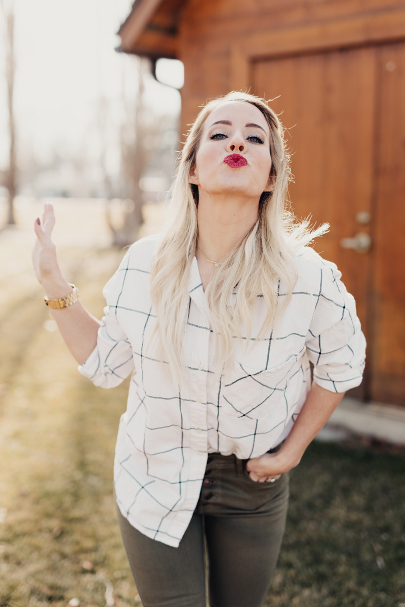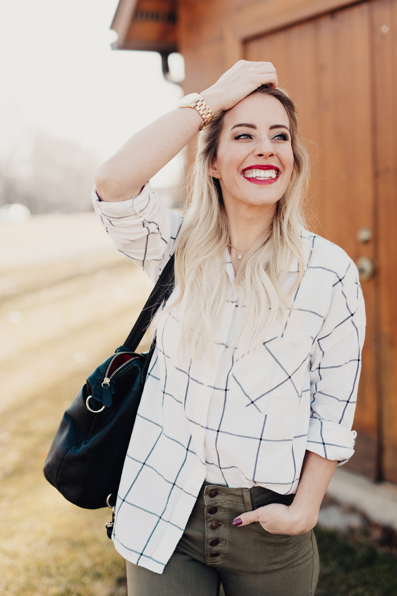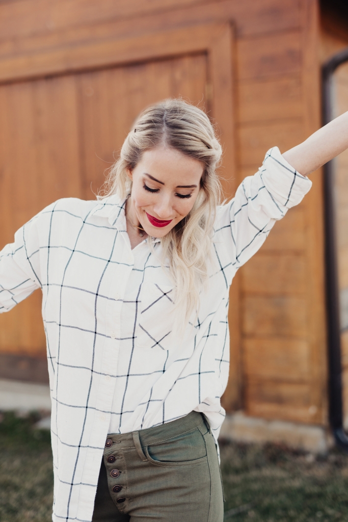 Boyfriend Button-Ups! They’re easily one of my favorite wardrobe staples. I wanted to share a few different ways I like to style them + dish the retailers I find has the best and most affordable button ups. Goodness gracious, have you ever noticed just how expensive button up shirts are?! It’s like buying a pair of jeans! There are a few things I look for in a good button up shirt, and I only buy them when they’re on sale. Old Navy, American Eagle, Forever 21, H+M — you can always get cute button up shirts from those retailers at a fairly reasonable price.