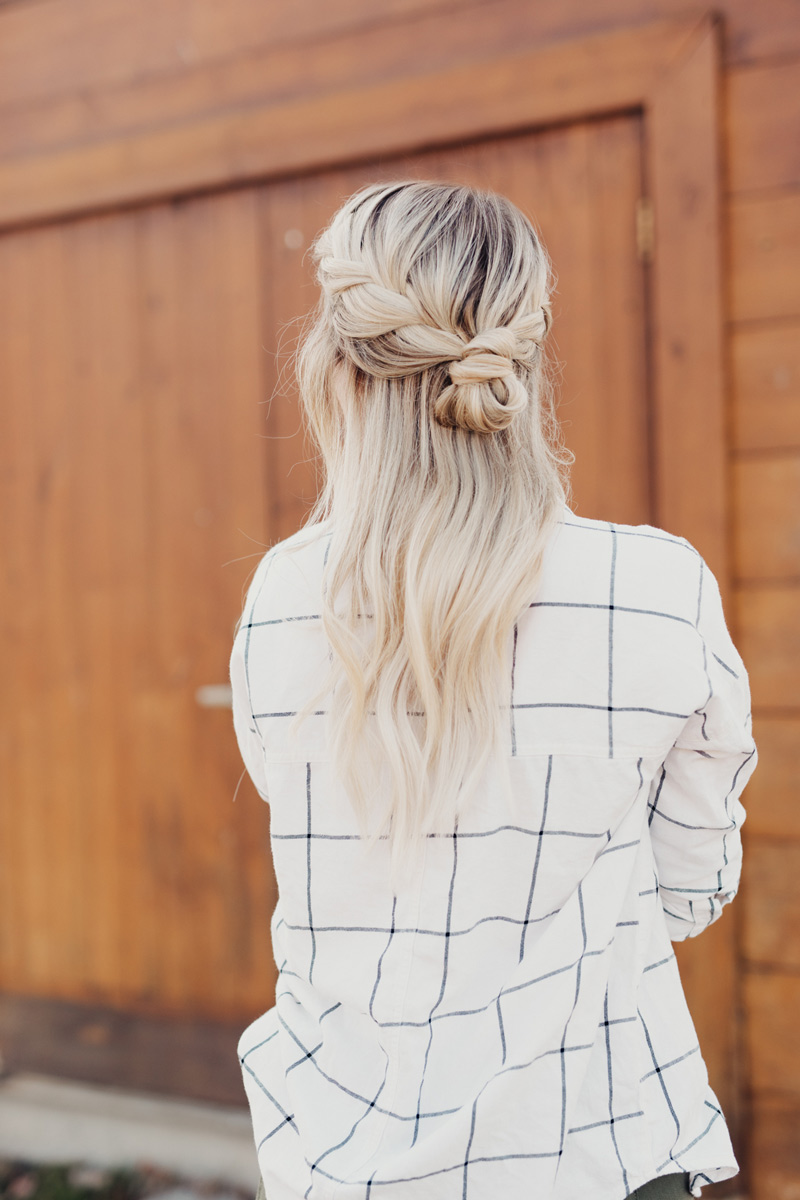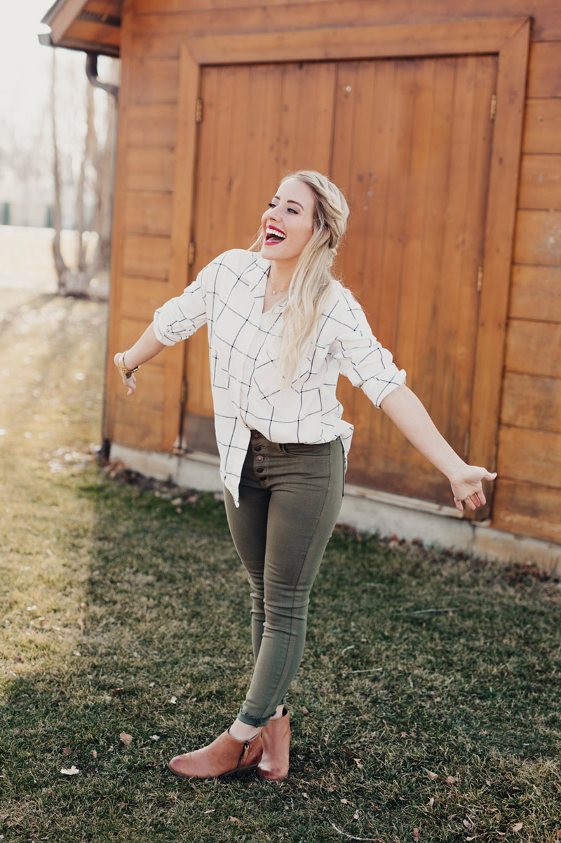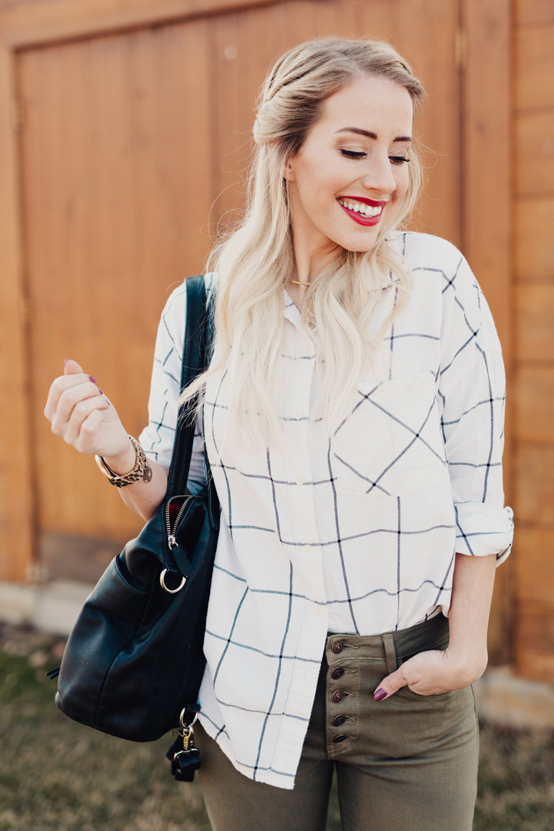 I look for the fit. I don’t care if it’s the prettiest color or pattern in the whole entire world! If I don’t want to live in it, I don’t want to buy it! There also needs to be room in the shoulders to move around. There’s nothing worse than a shirt you can’t move in! And then the shirt needs to be soft. I have a couple button ups that are fairly stiff and I just find I don’t wear them!! I have this one chambray shirt that is so cute, it fit all the criteria except it’s not crazy soft. And guess what? I literally never wear it! I typically go for neutral colors and patterns, except for when I don’t ? like in this post here. See, I haven’t worn that top as much as I would have liked, because the color and pattern are so bold. If I stick to neutral colors and patterns, they’re easier to wear over and over again.