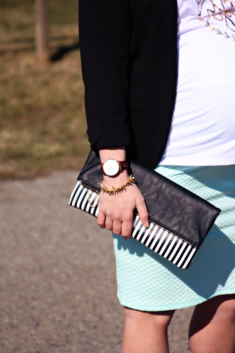 Stripe Clutch: Asos | Floral heels: Seychelles on Amazon (fit true to size and super comfy heel height) | Graphic Tee: c/o Poppy and Dot | Pencil Skirt: c/o Poppy and Dot | Blazer: Similar here and here | Hair Extensions: c/o Laced Hair | Lipstick: Mac All Fired Up | Watch: c/o Daniel Wellington | Bracelet: c/o Stella and Dot | Statement Necklace: Dying over this and this one | Delicate Gold Necklaces: c/o Made by Mary (more details on these amazing necklaces soon!)
