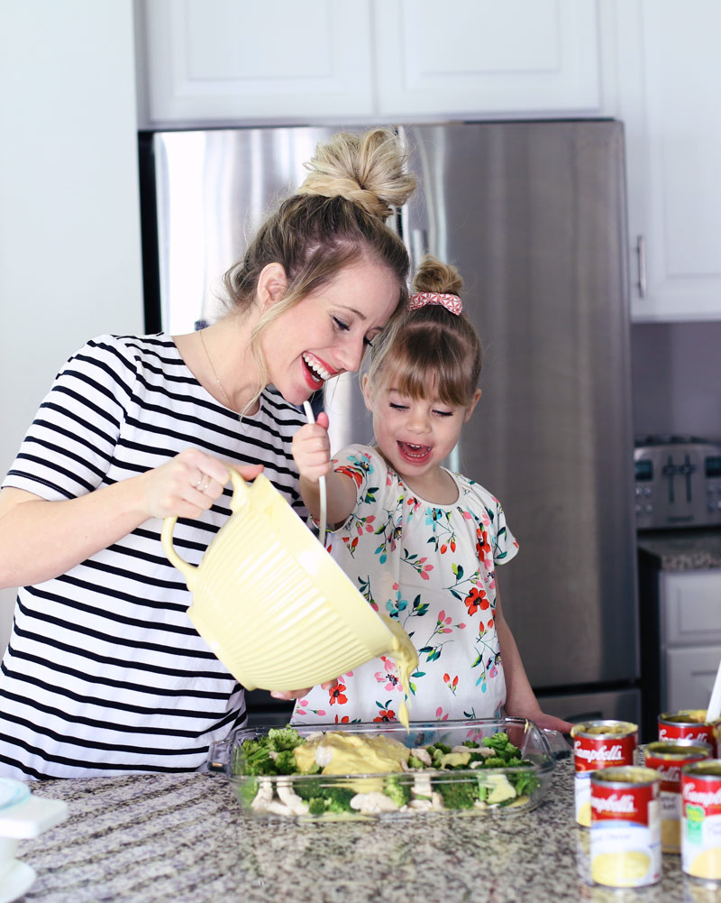 This afternoon Savy girl and I made some good ole’ Chicken Divan. I had Brian snap a couple pictures of us in the process and decided to share the recipe on le blog. This is one of those meals that just reminds me of home, my mom used to make it all the time and my kids love it. I’ve been doing the 21 Day fix for awhile now so I left out some chicken and broccoli so that I could stay on the meal plan, but it’s definitely a family favorite and something you guys should keep in your recipe box if you haven’t tried it out yet! Also, don’t judge the photos because I’m definitely not a food photographer haha!