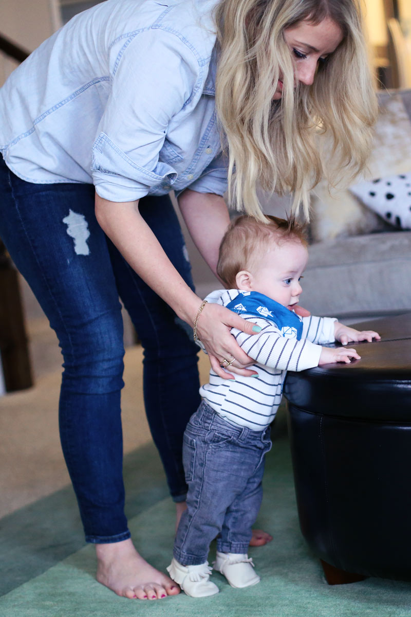 Chambray top: Jcrew Factory (on sale). Jeans: Gap, sizing going fast! | Boys shirts: Macy’s (on sale). Drool Bibs: c/o Cooper Pearl (TWISTPRETTY for 20% off, good until the 19th!). Boys Jeans: old, other favs here Moccs: c/0 Freshly Picked in Birch | Rug: Rugs USA (70% off) Baskets: Target 1/2/3. Lights on the wall: Amazon. Teepee: Tnee’s. Quilt: Second Stitch to the Right. | Toys: Guitar and Caterpillar