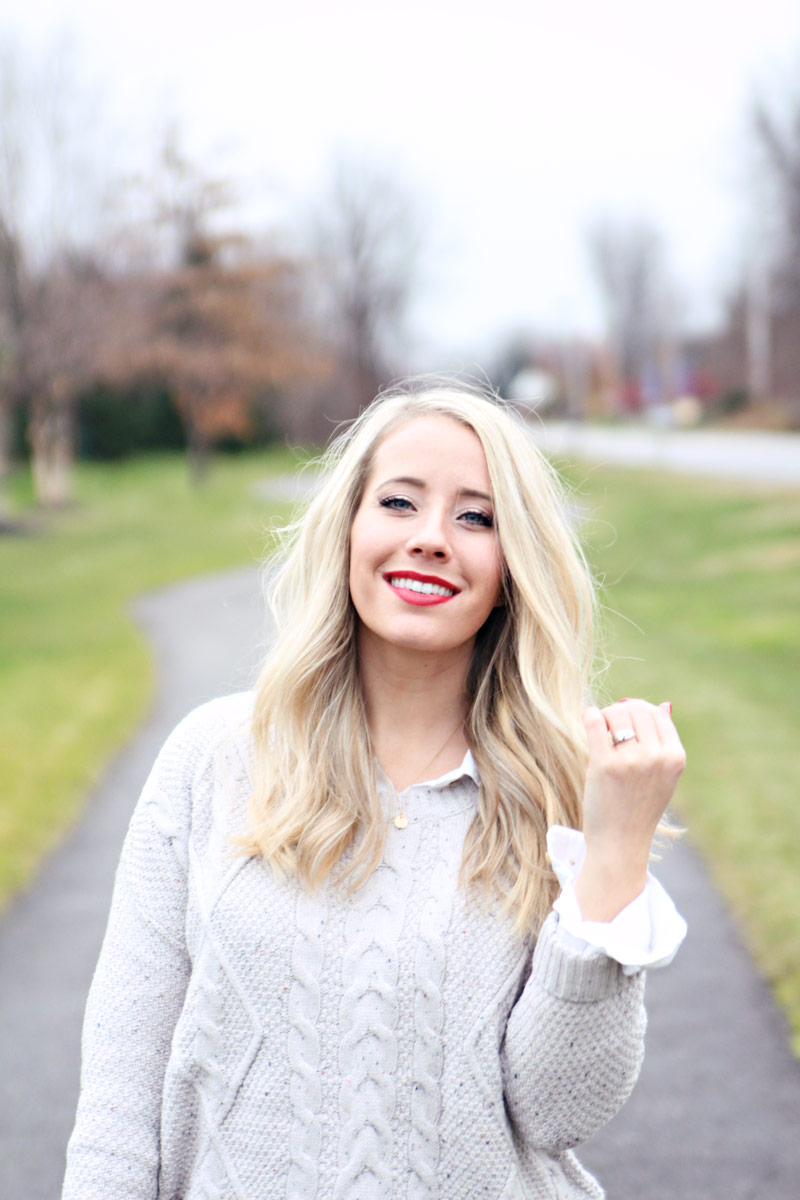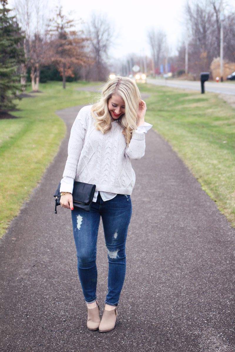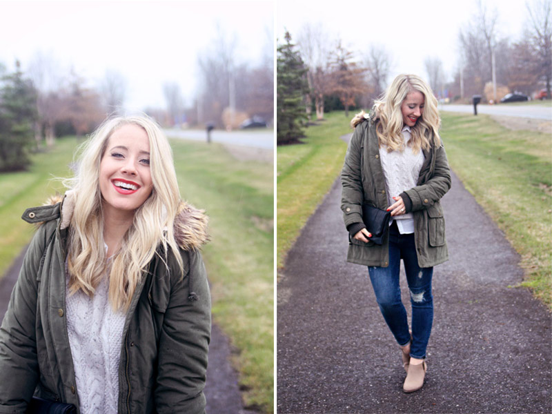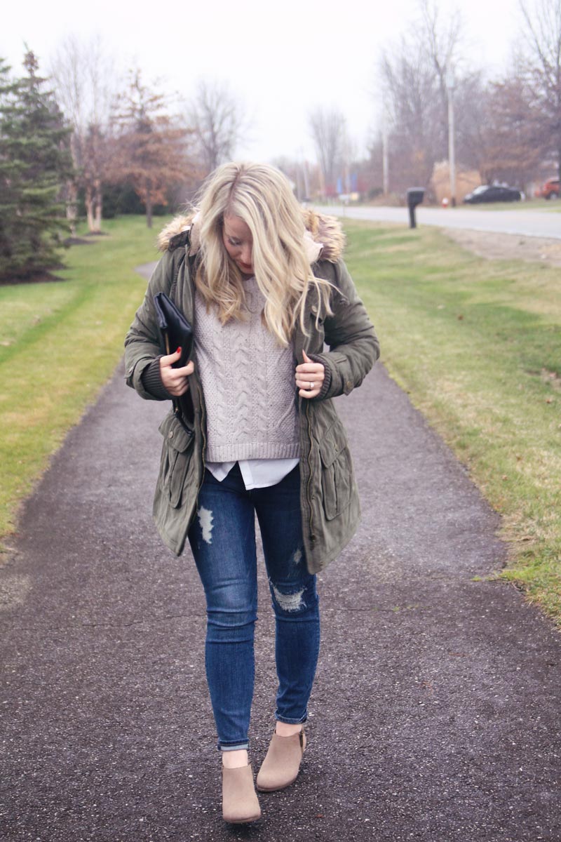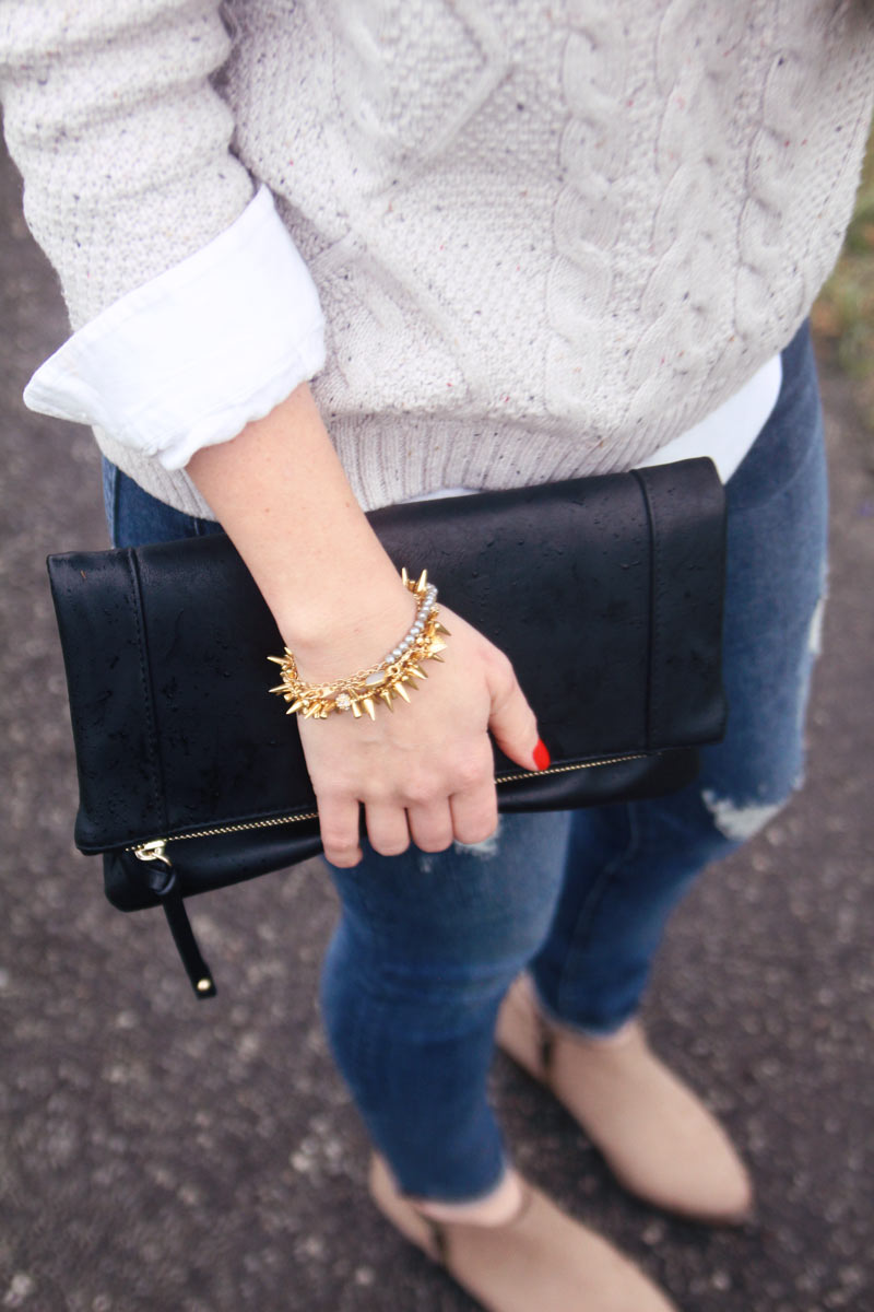 Sweater | Distressed Jeans | Faux Fur Trim Coat STILL ON SALE! | Booties | Foldover Clutch | Jewelry | Bracelets | Lipstick