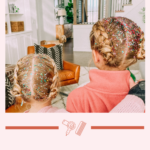 I started with my favorite spray bottle and wet down the hair and do a quick comb through to get rid of any tangles leftover from bedtime. If your little one is especially prone to frizzy hair I like this anti-frizz smoothing serum. After prepping the hair I took a comb and parted her hair right down the middle. Hint- plan ahead, if you want the glitter to cover the part then you don’t need to worry about keeping it too tidy. However, I found it a little tricky to get the part covered so next time I will definitely pay more attention to getting a nice even part.