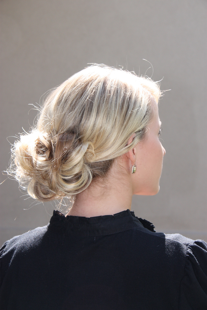 I did a different technique than you did on this one, I went ahead and scrunched my hair in a ball and then put an elastic band around it to give it that messy look and then pinned it. You can see the style and my look in the first photo on this blog post