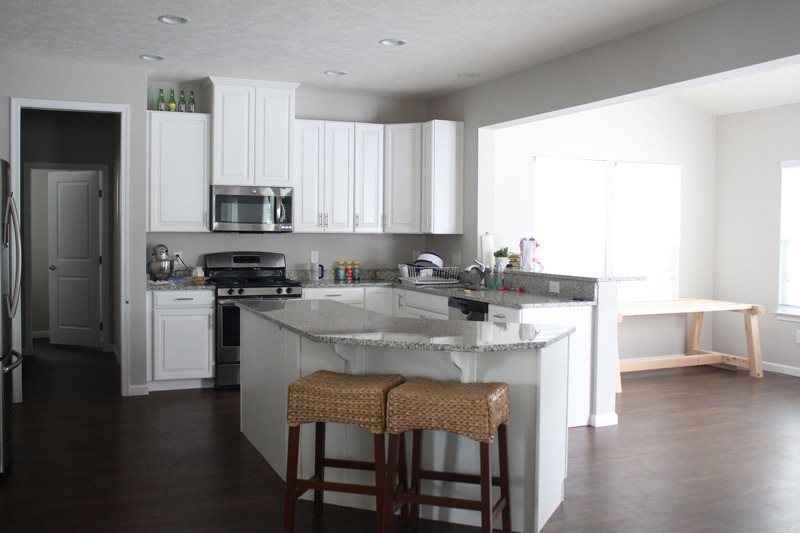 ^^ My most favorite room in the entire house. I was not planning on taking pictures of the kitchen or family room but thought I’d share while I was at it. I probably should have tidied it up a little more! In the corner you can see we are building a farmhouse table, it’s coming along but ever so slowly! I need some window treatments and a rug in the morning room for sure and I know those stools in front of the bar are really big but they are so perfect with my little kids so I haven’t decided if I should get ones that fit that space better. Have any stool recommendations? We plan on adding a backsplash at some point.