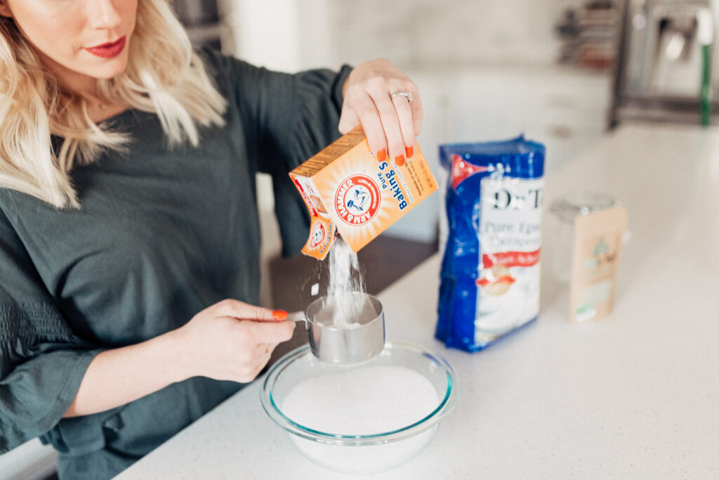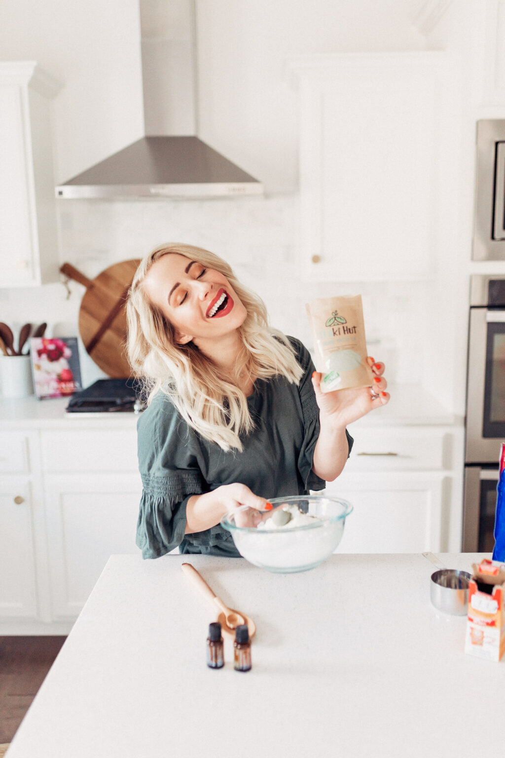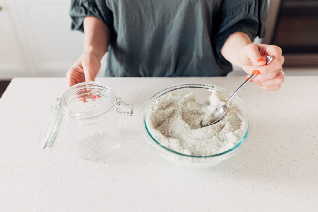 In a bowl, mix together 3 cups salt, 1 cup coconut oil, 15 drops of Peppermint Essential Oil and 10 drops Lemon Essential Oil. The salt gently sloughs off dry skin, the coconut oil moisturizes, and the lemon and peppermint oil provide a mood boost. The matcha green tea powder gives it a pretty green color (optional).