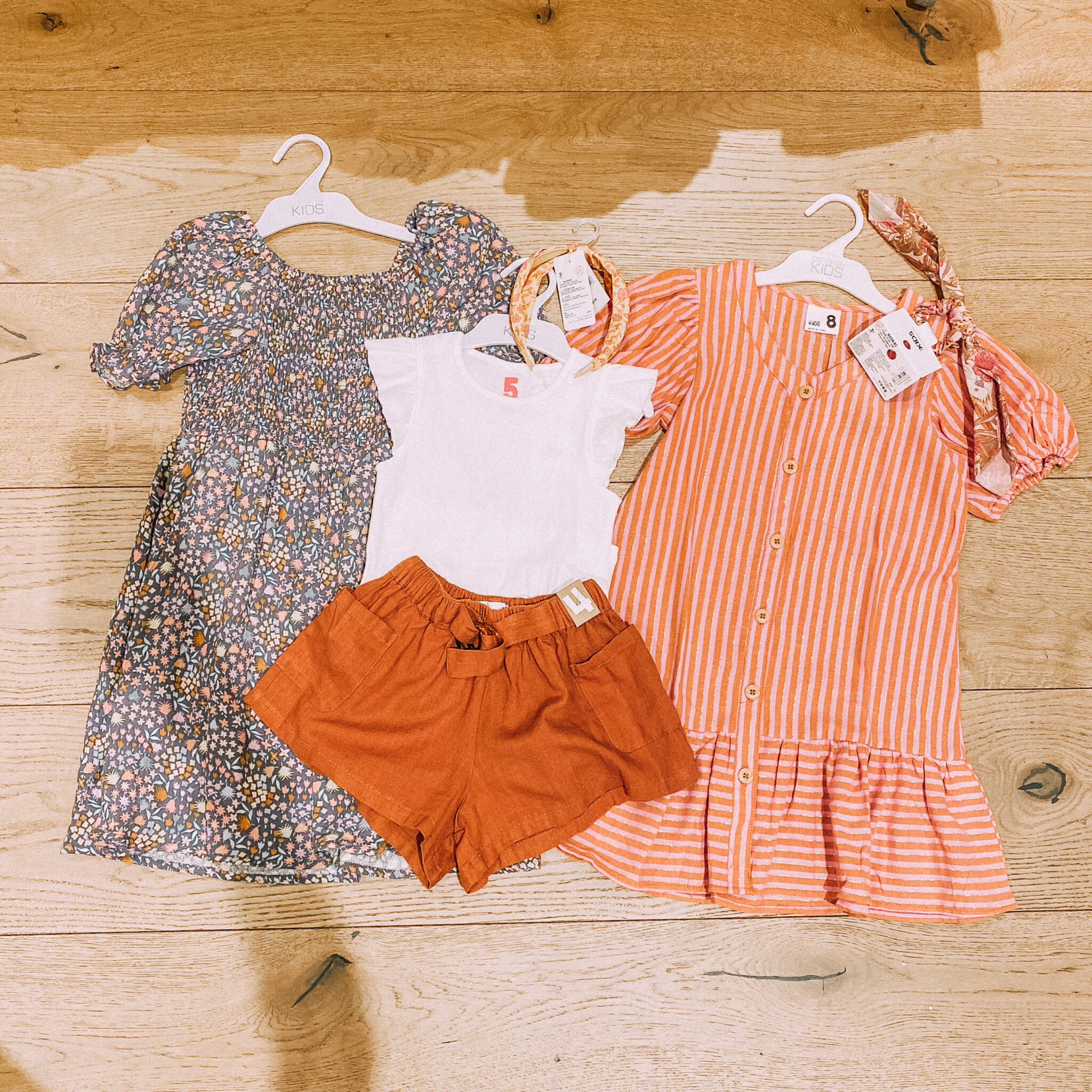 For the girls we mixed it up and I love the way it turned out! A floral print with a neutral base and that rust color element that popped for Demi. And I love love the pink and camel vertical stripe dress that we found for miss Sav because it tied in so well to the scheme, while still mixing it up and adding a different texture to the overall look. And then little miss Molly with the neural dressy shorts and white top pulled the prints in and tied it all together.