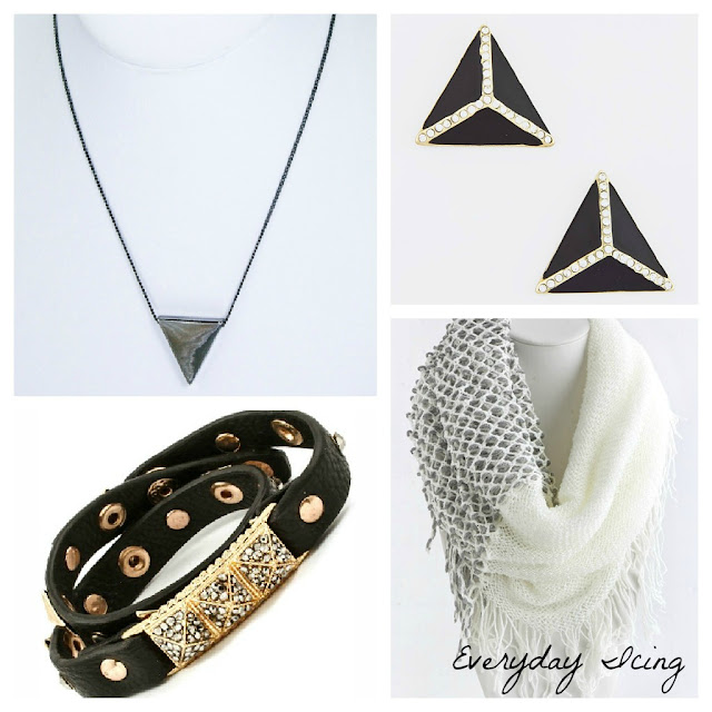Everyday Icing is giving away the Hematite Triad Necklace, the Pave Wrap Bracelet, the Black Triad Earrings and the Grey and White Infinity Scarf to one lucky Twist Me Pretty Reader. That’s a sixty dollar value!