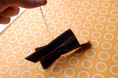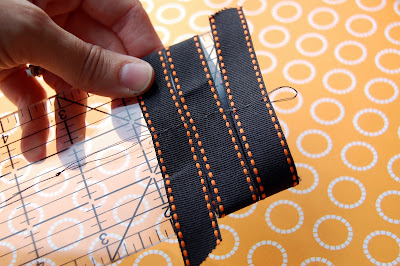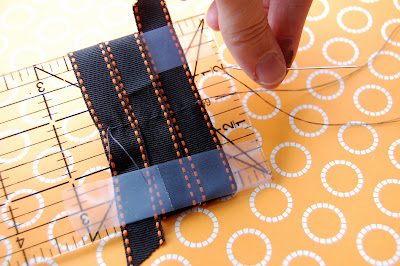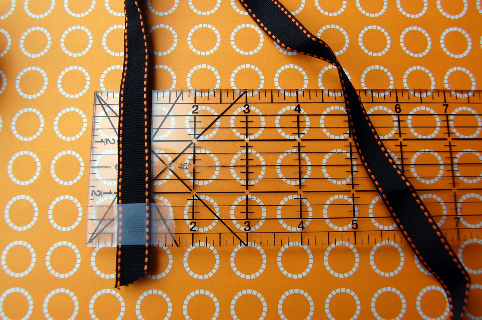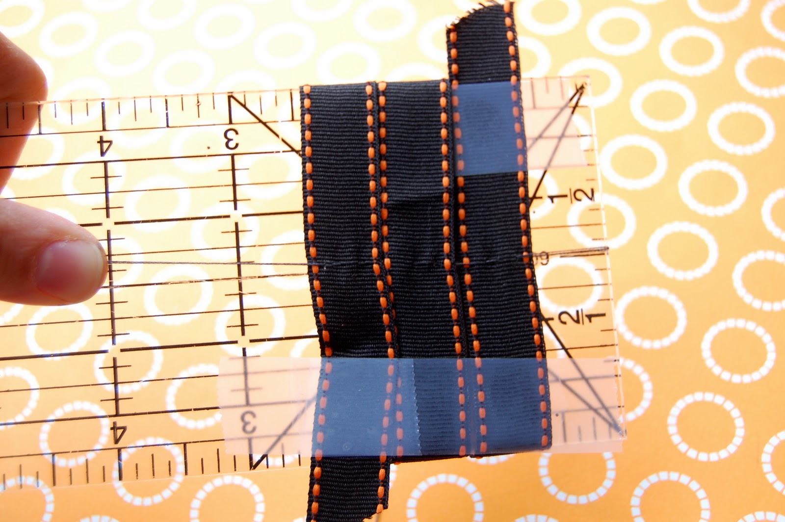 Step 5: Flip the ruler over, and sew up the back. There are only 2 rows of ribbon to get through. Make sure your needle is pointing in the direction away from the ruler’s edge.