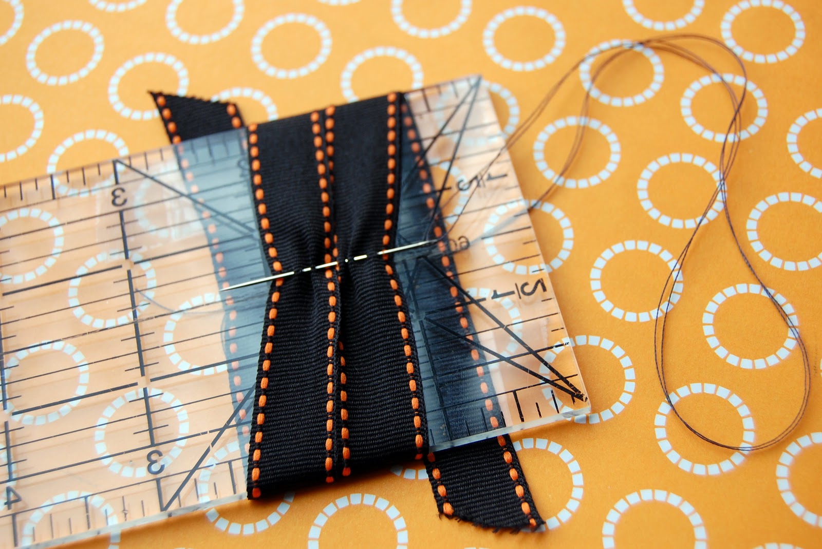 Step 3: Find the center of the ruler, and start hand sewing through each ribbon. Point in the direction of the edge of the ruler. Double your thread, but you don’t need to tie a knot at the end.