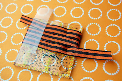Step 2: Wrap it around the ruler 3 times, and tape the edges to ruler. (You’ll see 3 rows of ribbon on top and 2 rows of ribbon on the bottom).