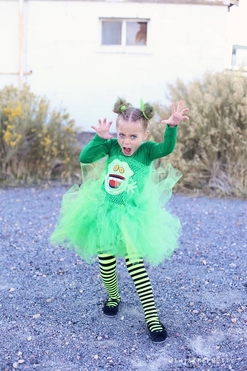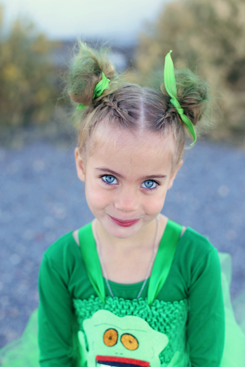 For Savy’s hair I styled four dutch braided buns. You can’t really see from this angle but there were 4 big fluffy buns, not two. I teased the tails so they were super puffy and crazy and then pinned them into messy buns. Then I tied green ribbon around the base of the buns, got some green hair spray and just spritzed the buns a few times with it. It turned out so cute!