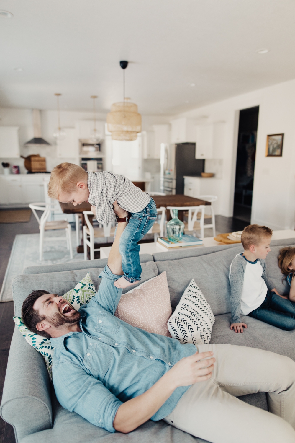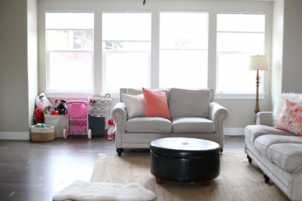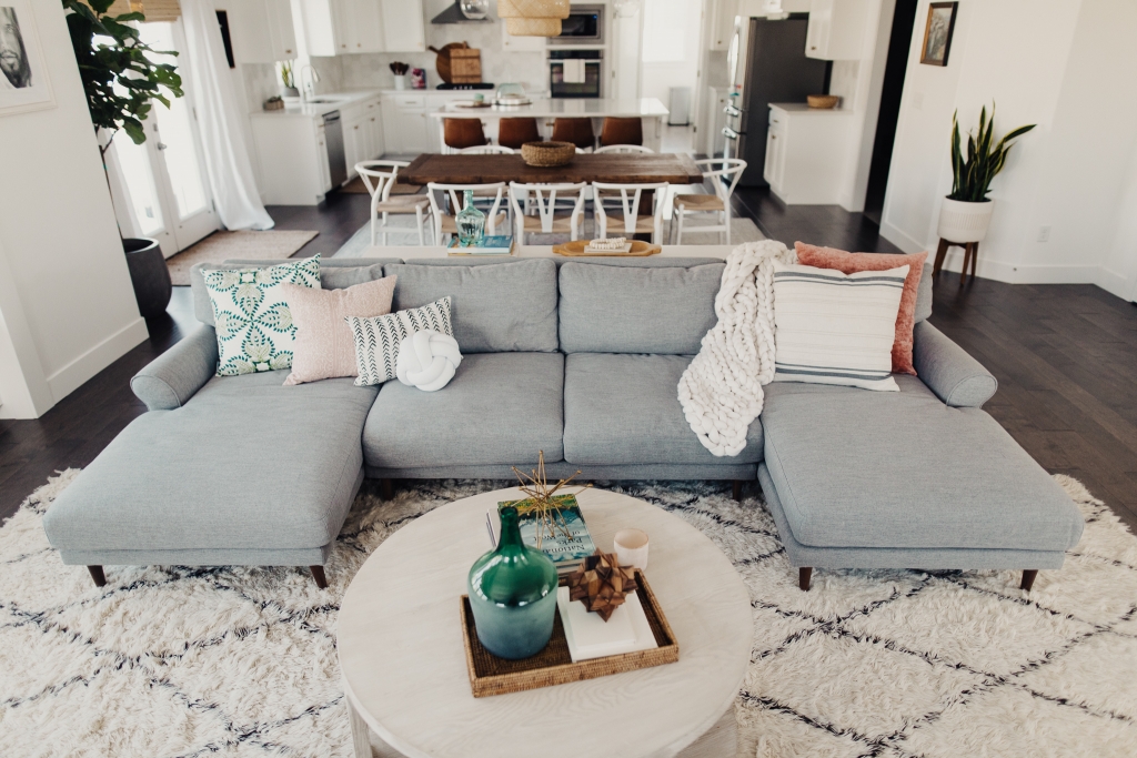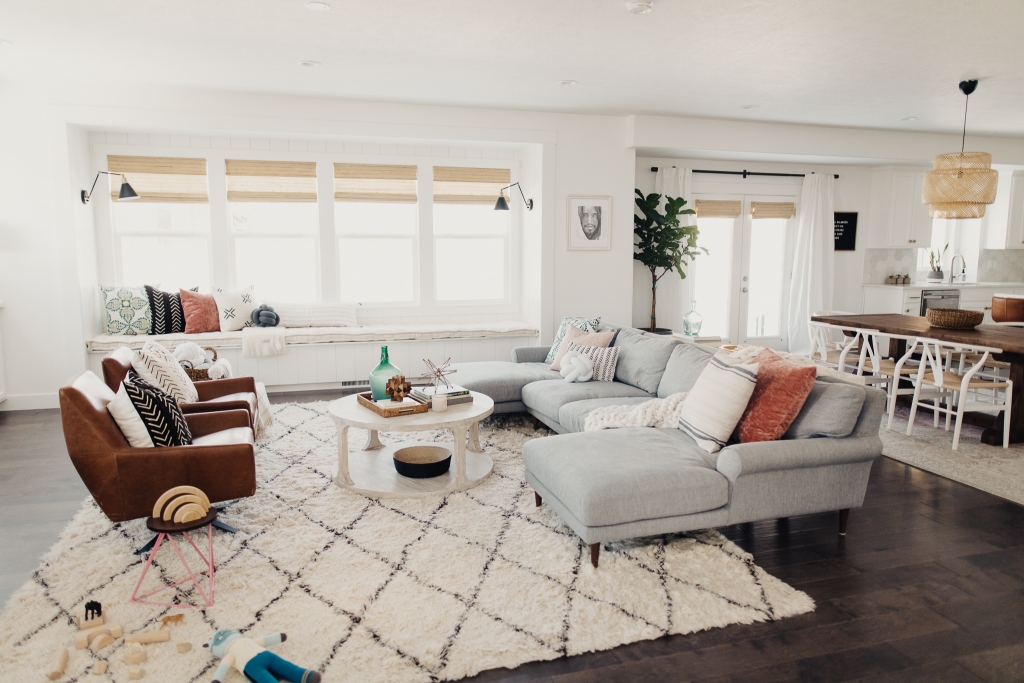 We decided to go with the Maxwell U-Sectional from Interior Define. It fits the space perfectly! This couch is large and feels like a sectional, but keeps things open so that the window seat isn’t hidden behind a couch! It took 10 weeks to arrive and it was love at first site. We got the Dove Pebble Weave fabric and so far it’s been super kid friendly, washes well and I’m obsessed with the shape. We chose the Maxwell because it has a higher seat and back than other sofas on their website and then we just ditched the pillows that came with it. It really comfortable and I can’t recommend Interior Define and the whole process of ordering online enough!